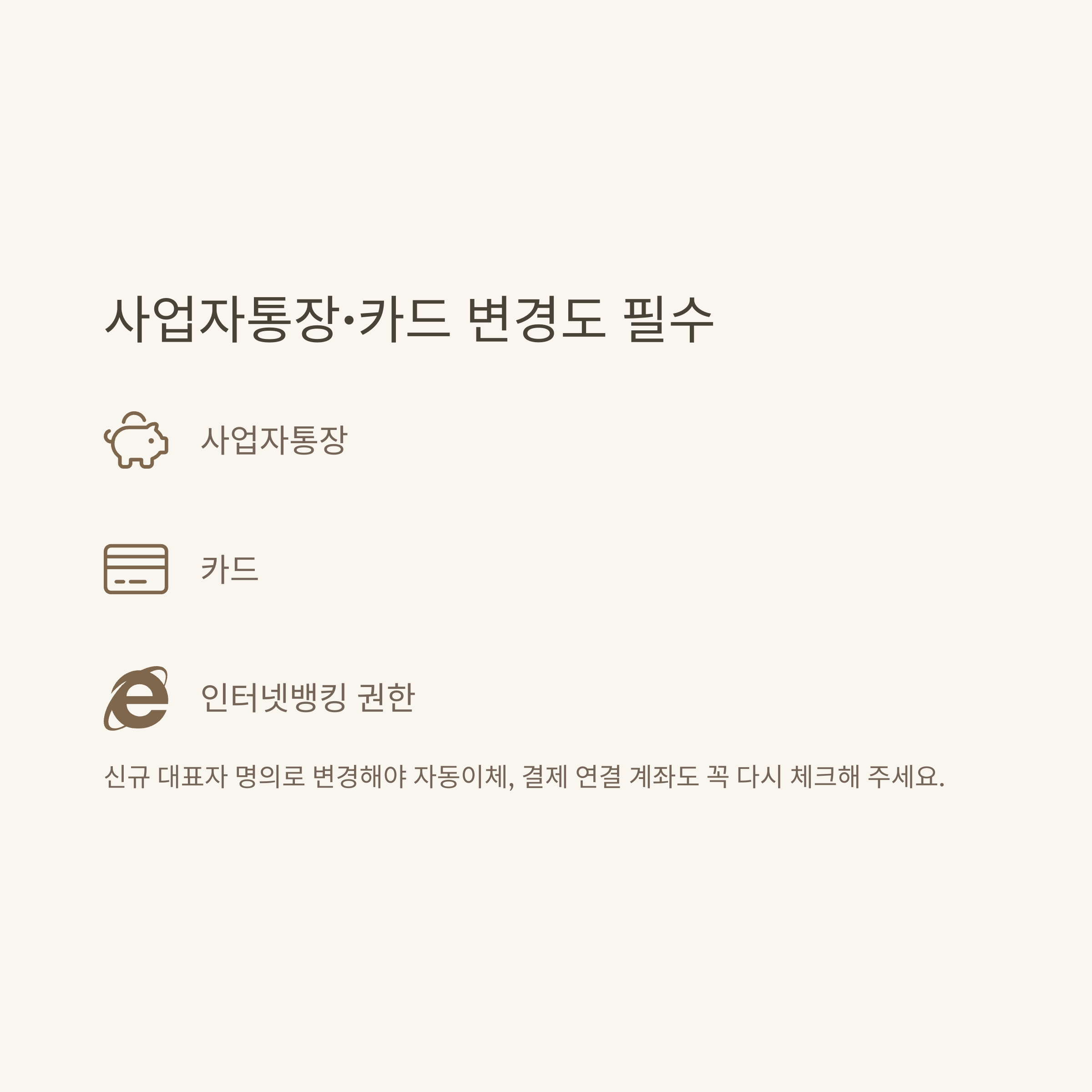 대표자변경 사실을 은행에 반드시 알리고, 필요한 서류(사업자등록증, 변경신고서, 신분증 등)를 챙겨가시면 당일 처리되는 경우가 많았습니다. 혹시 기존 통장으로 자동이체나 각종 결제가 연결되어 있다면, 신규 대표자 계좌로 전환해두는 것도 절대 잊지 마세요.