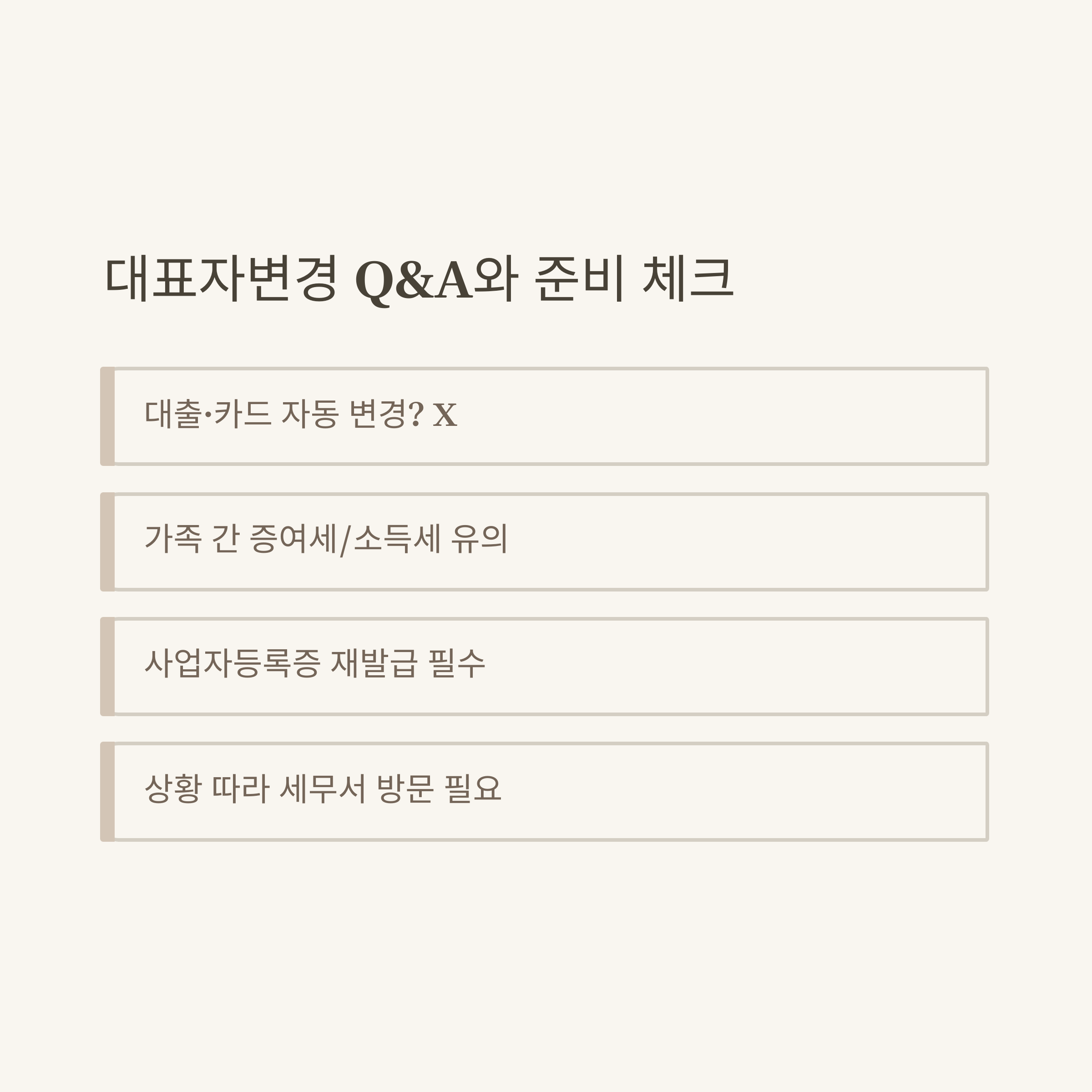 A. 절대 아닙니다. 은행, 카드사, 보증기관 등에 모두 별도 신고해야 하며, 심사 절차가 따로 있습니다. - Q. 가족 간 대표자변경 시 세금 문제는 없나요?