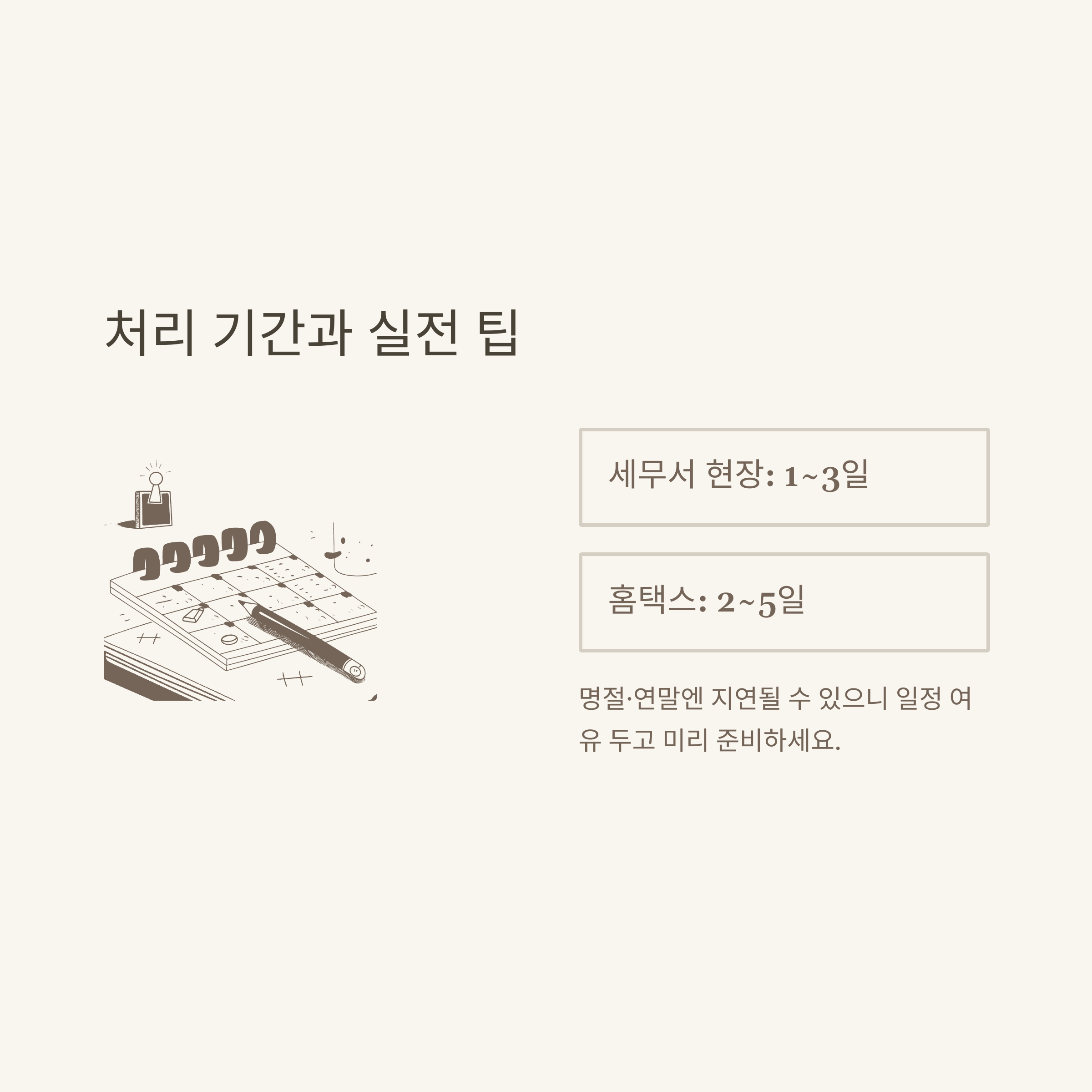 | 세무서 방문 | 1~3일 | 현장 민원실 접수 |