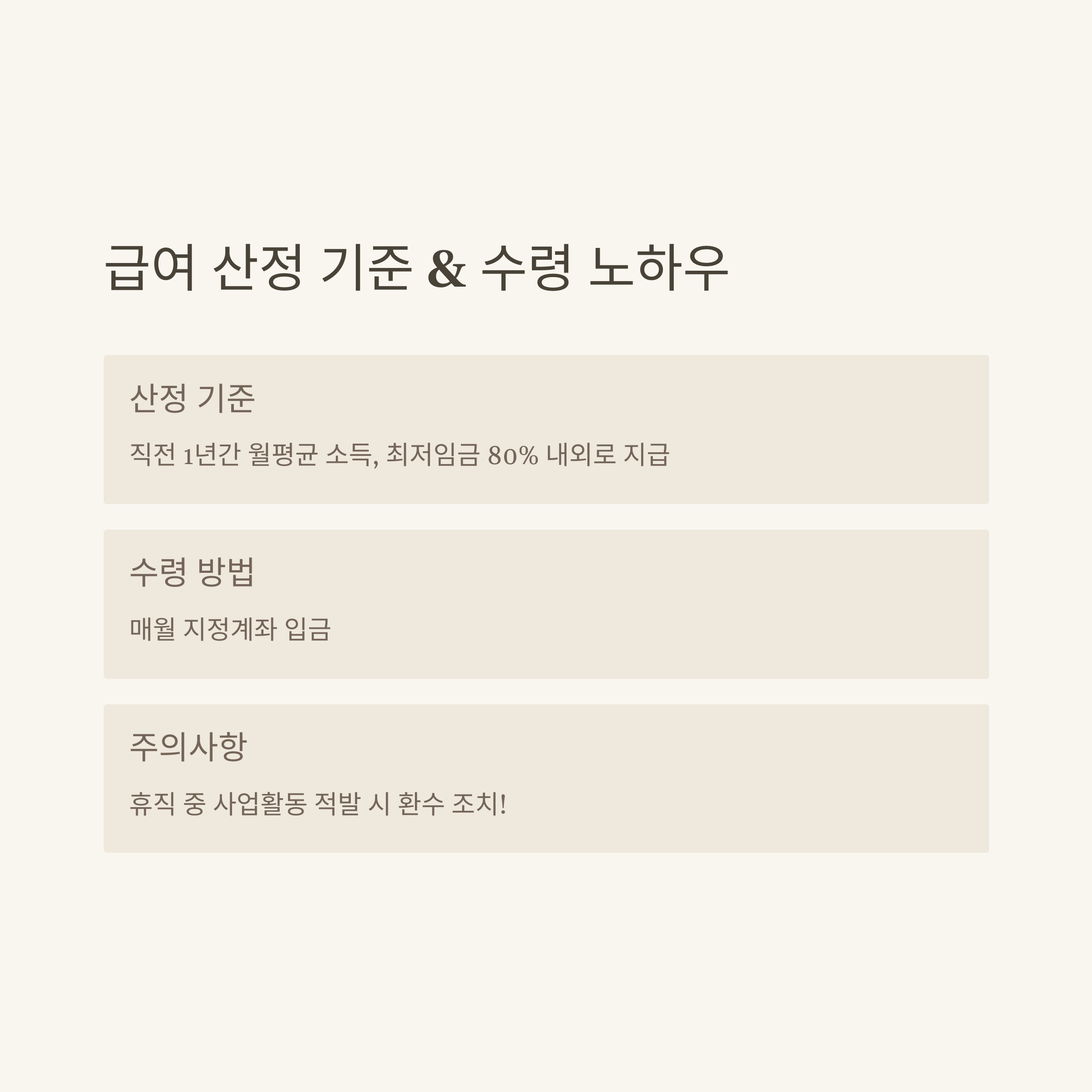 수령은 매월 지정한 계좌로 입금되는데, 중간에 매출 변동이나 휴직 계획 변경이 생기면 즉시 고용보험센터에 신고해야 불이익을 피할 수 있습니다. 특히 실제 휴직 중 사업 활동이 발견될 경우, 지원금 환수나 불이익이 발생할 수 있으니 주의가 필요합니다.