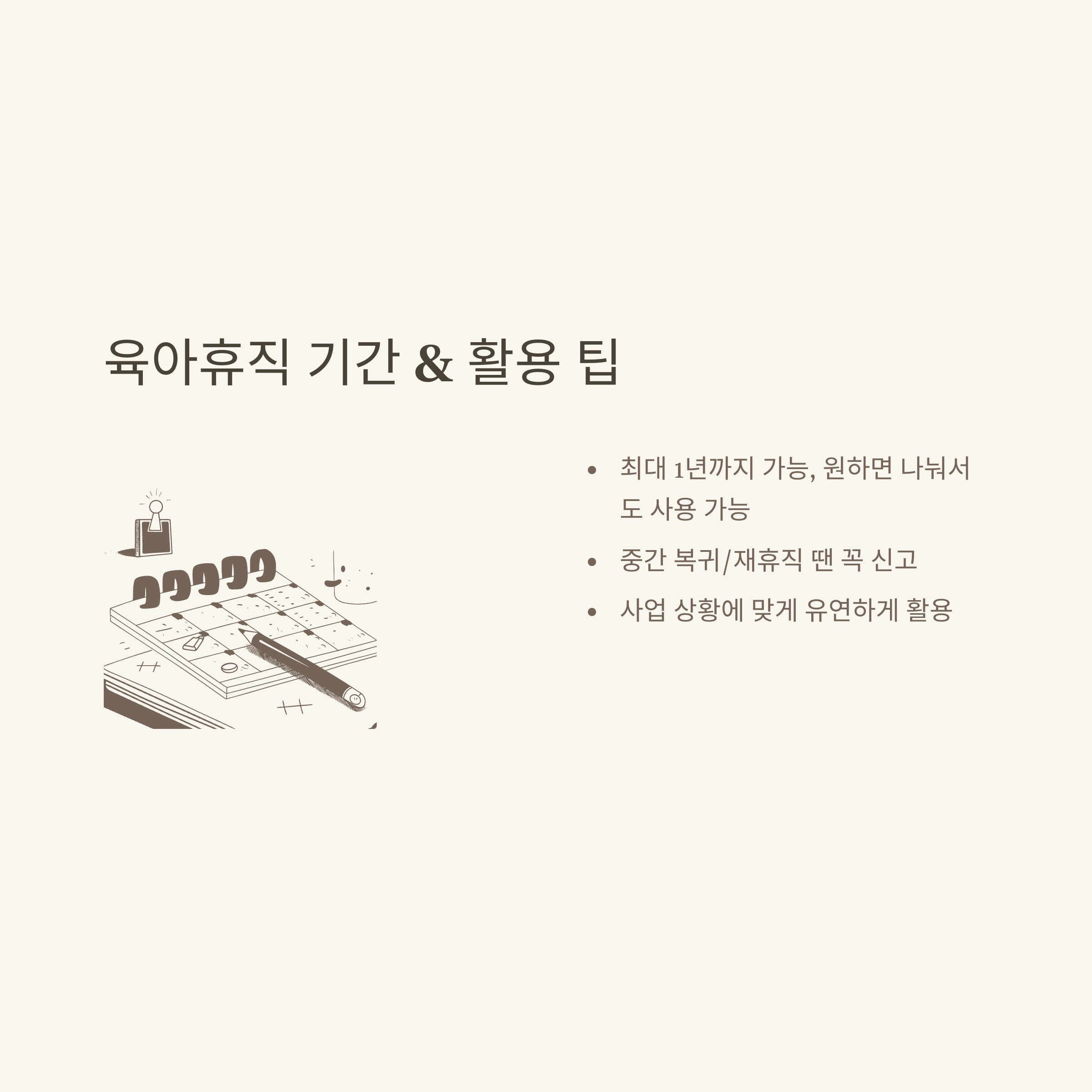 실제로 육아휴직을 고민할 때 가장 궁금했던 게 '얼마나 쓸 수 있을까?' 였습니다. 개인사업자는 직장인처럼 최대 1년까지 사용할 수 있지만, 사업장 상황에 따라 기간을 쪼개서 신청할 수 있다는 장점이 있습니다. 저는 처음엔 한 번에 길게 쉬는 게 나을까 고민하다가, 실제로는 몇 달 단위로 나눠 쉬면서 사업을 유지하는 방법을 선택했습니다.