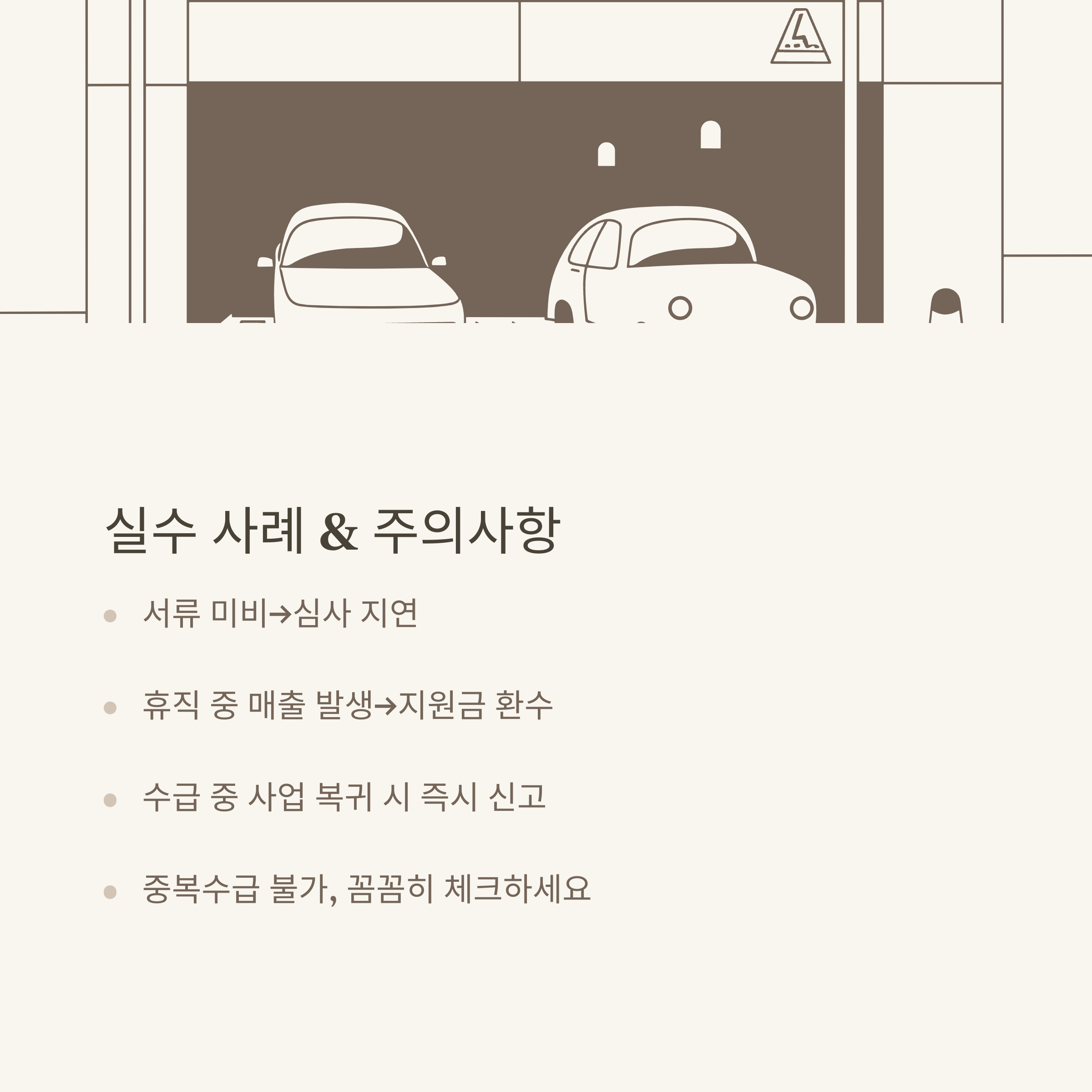 제가 주변 사업자 지인들에게도 많이 들었던 이야기인데, 실제로 “서류 하나 빠져서 한 달 넘게 지원금이 지연됐다” “휴직 기간 중 매출이 발생했다는 이유로 환수 조치가 됐다” 같은 실수 사례가 정말 많았습니다. 저 역시 처음 신청할 땐, 기간과 서류만 맞추면 문제없겠지 했는데, 지원금 수령 후에도 계속 매출·사업 현황을 체크받으니 긴장을 늦출 수가 없었어요.