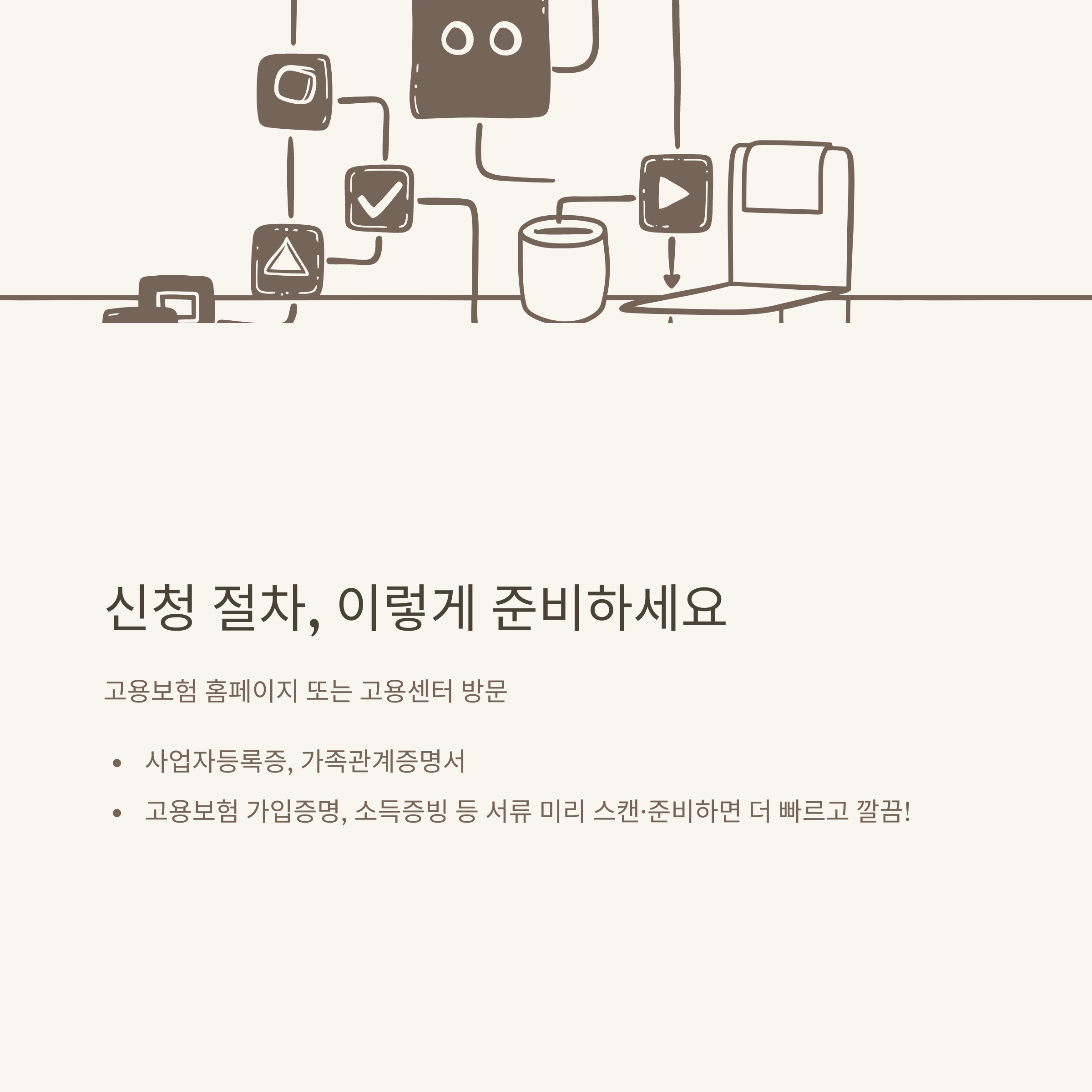서류는 사업자등록증, 가족관계증명서, 고용보험 가입증명서, 사업소득증빙자료 등 기본적인 자료와, 추가로 필요하면 육아휴직 사유서도 요구받을 수 있으니 여유 있게 준비하세요.