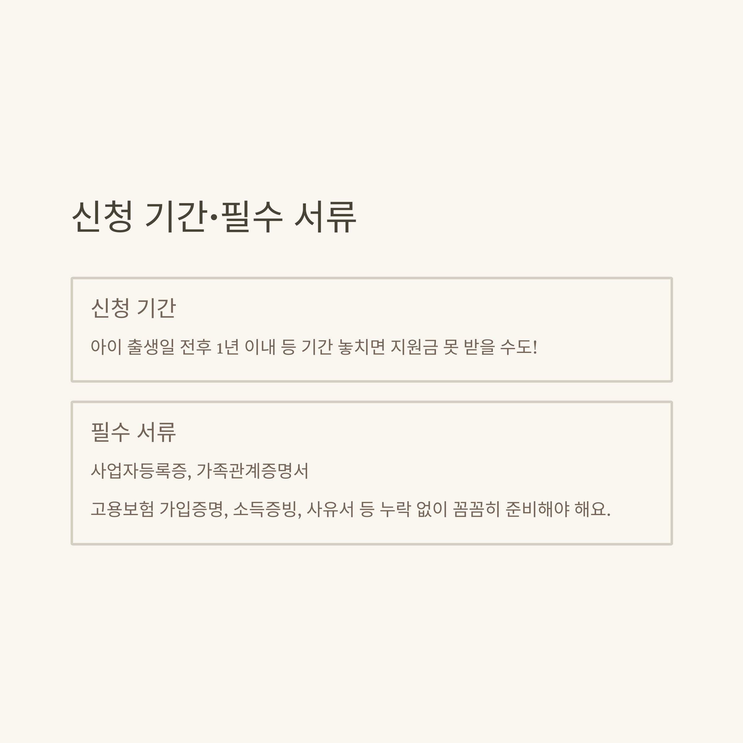 결론적으로 ‘개인사업자도 일정 조건만 충족하면 육아휴직 지원금을 받을 수 있다’는 점을 알게 됐습니다. 물론 직장인과는 신청 절차와 조건이 다소 다르기 때문에 실제로 상담을 받아보는 것이 꼭 필요하다고 느꼈어요.