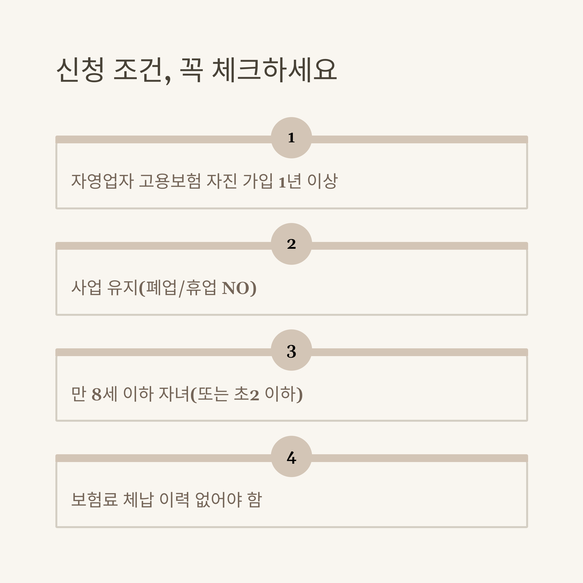 제가 실제로 고용보험센터에서 안내받은 개인사업자 육아휴직 신청 조건은 생각보다 까다로웠습니다. 단순히 사업자등록증만 있으면 되는 게 아니라, 자영업자 고용보험에 자진 가입해 1년 이상 보험료를 납부해야만 지원 대상이 됩니다.