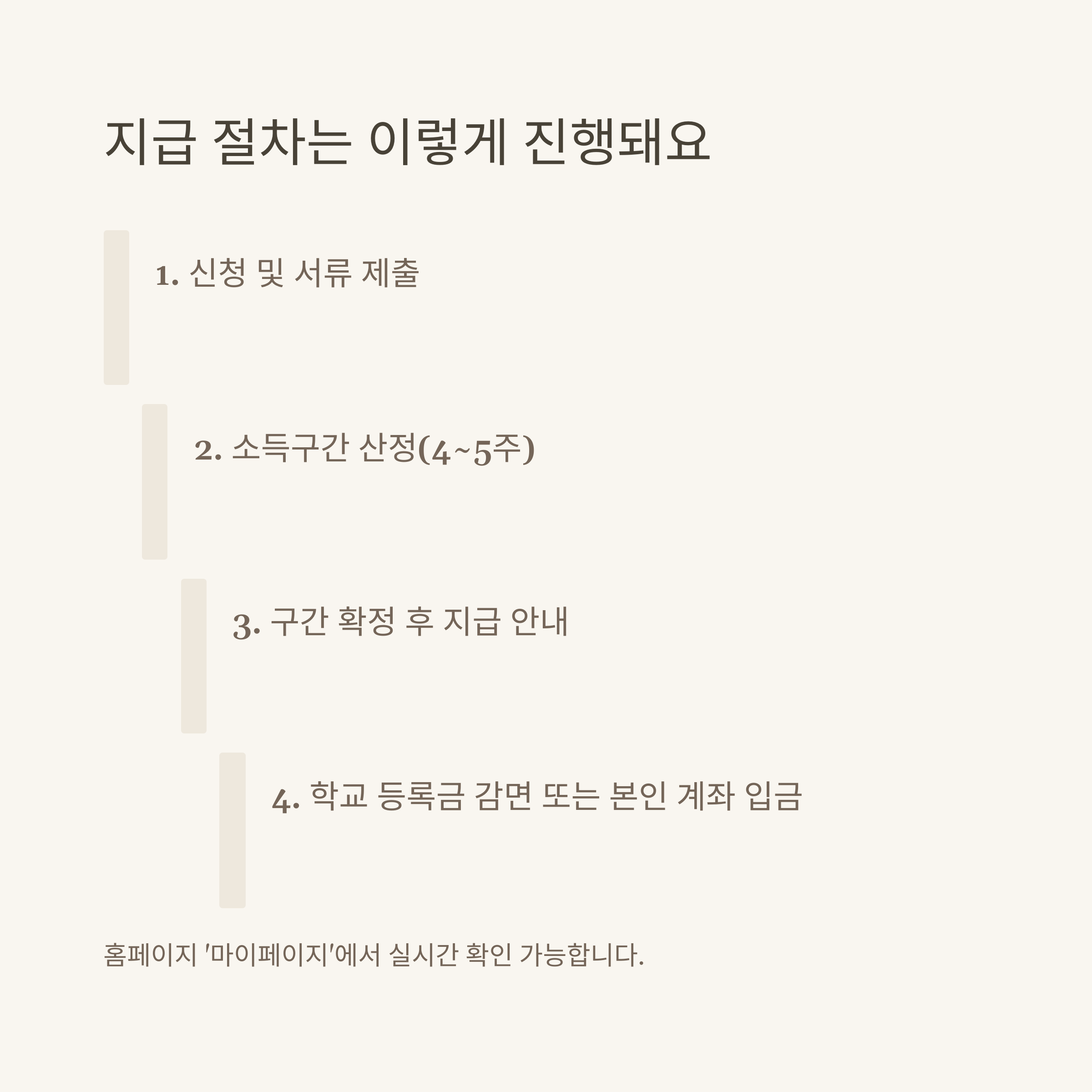 지급 절차는 크게 ▲신청 → ▲서류심사 → ▲소득구간 산정 → ▲지급 확정(문자, 홈페이지 확인) → ▲학교로 장학금 입금 → ▲최종 등록금 감면(또는 계좌 지급) 순서로 진행됩니다.