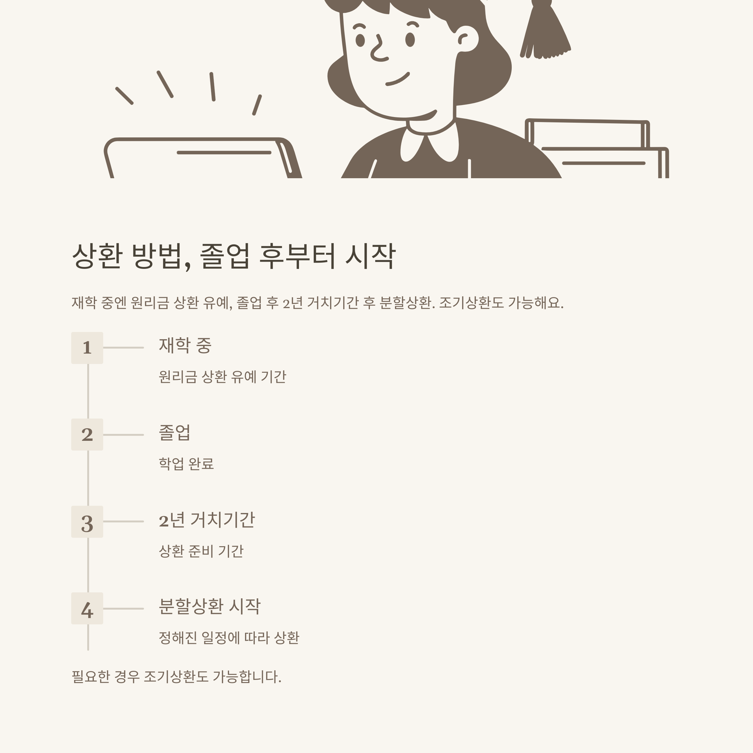 | 졸업 후 | 거치기간(2년) 후 분할상환 | 조기상환 가능 |