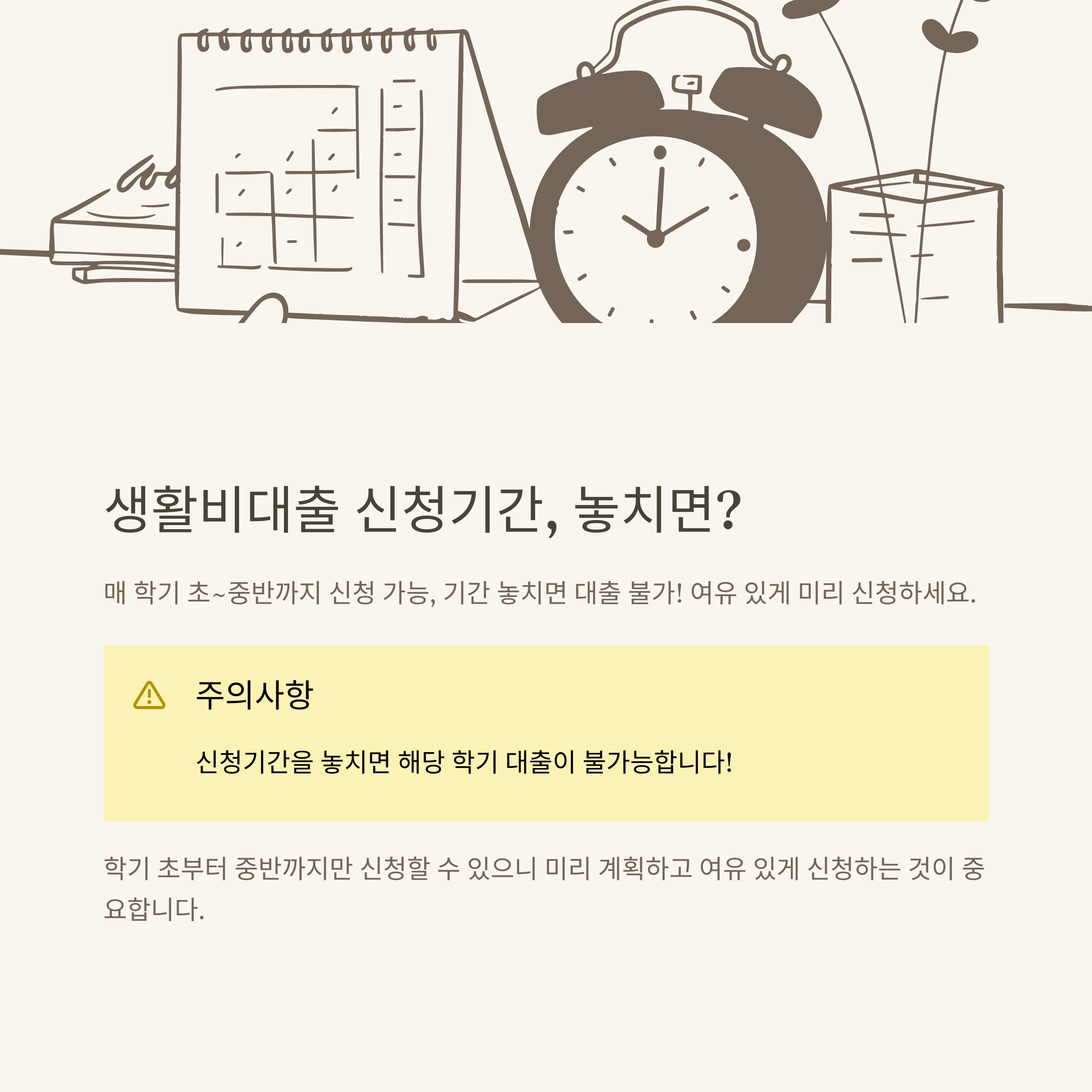 신청기간을 놓치면 대출 자체가 불가능하니 정말 주의가 필요합니다. ‘기간 연장’이 거의 없고, 마감 당일엔 시스템 접속이 몰려 지연될 수 있으니 하루 이틀 여유를 두고 신청하는 것이 안전합니다.