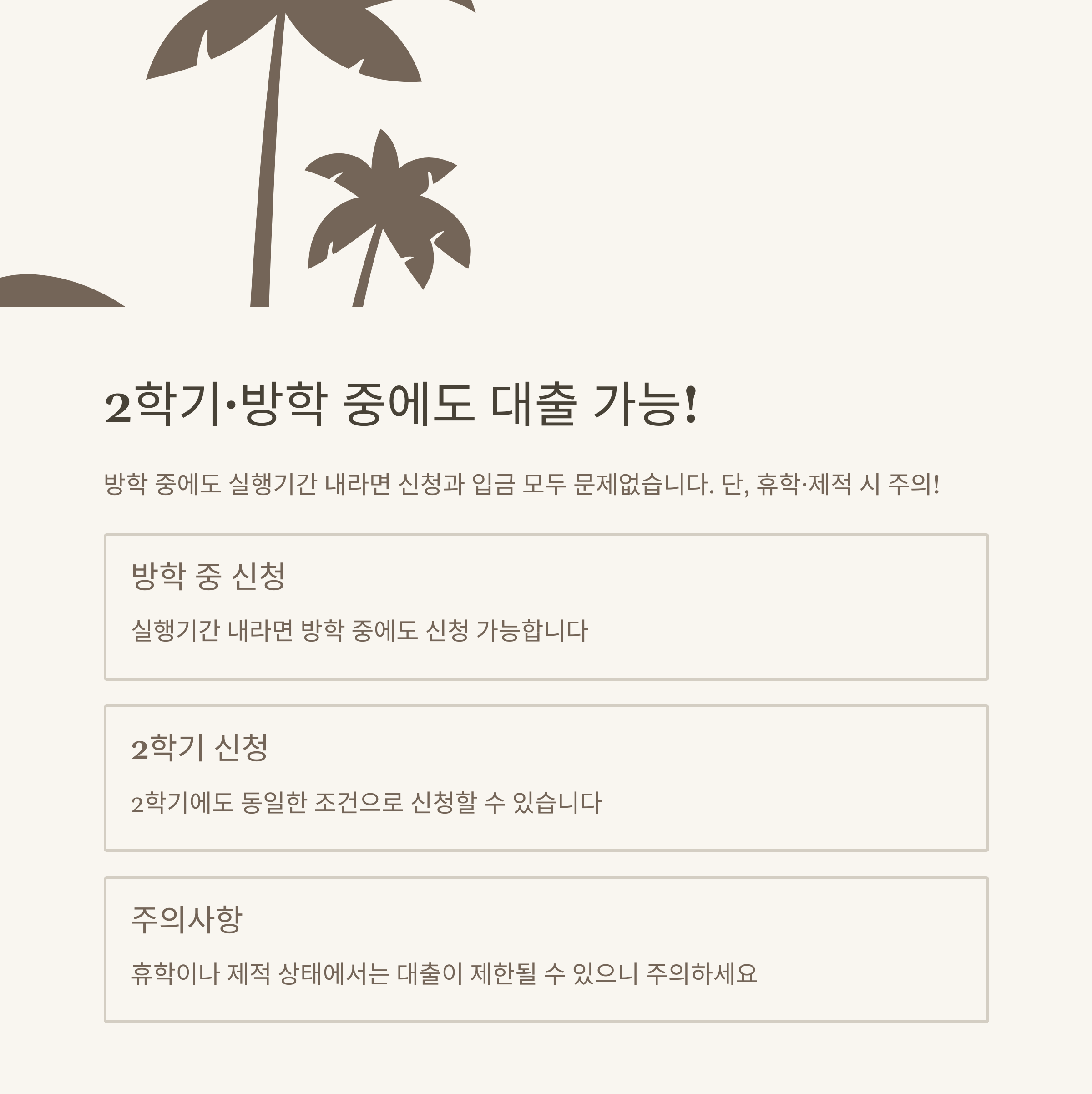 특히 방학 중엔 추가 생활비가 더 필요할 때가 많아, 미리 공지 확인 후 신청하는 친구들이 많았어요. 단, 등록휴학, 제적 등 학적변동이 생기면 대출이 자동 취소될 수 있으니 꼭 학적상태를 먼저 확인하세요.