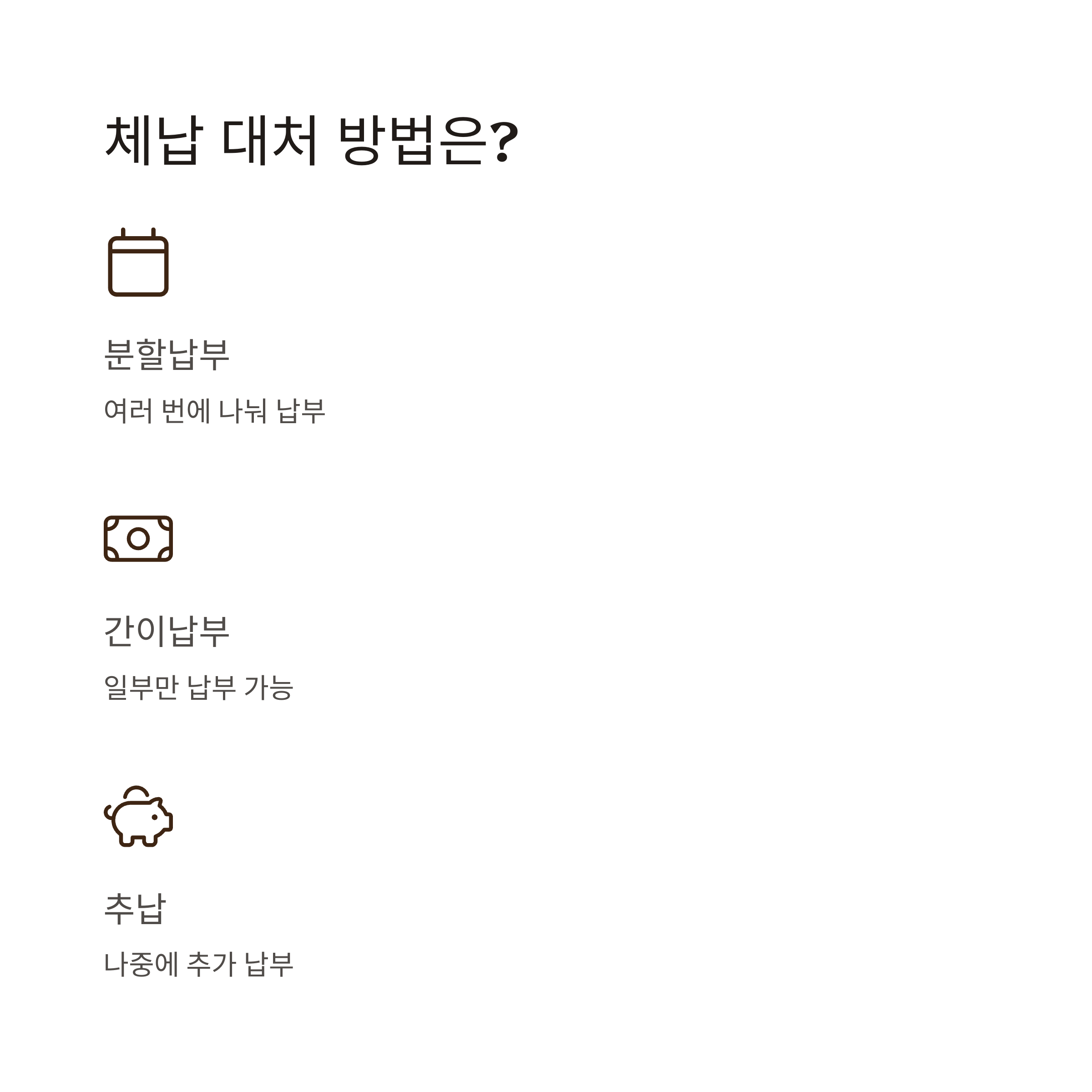 | 해결 방법 | 분할납부, 추납, 간이납부, 이의신청 |
