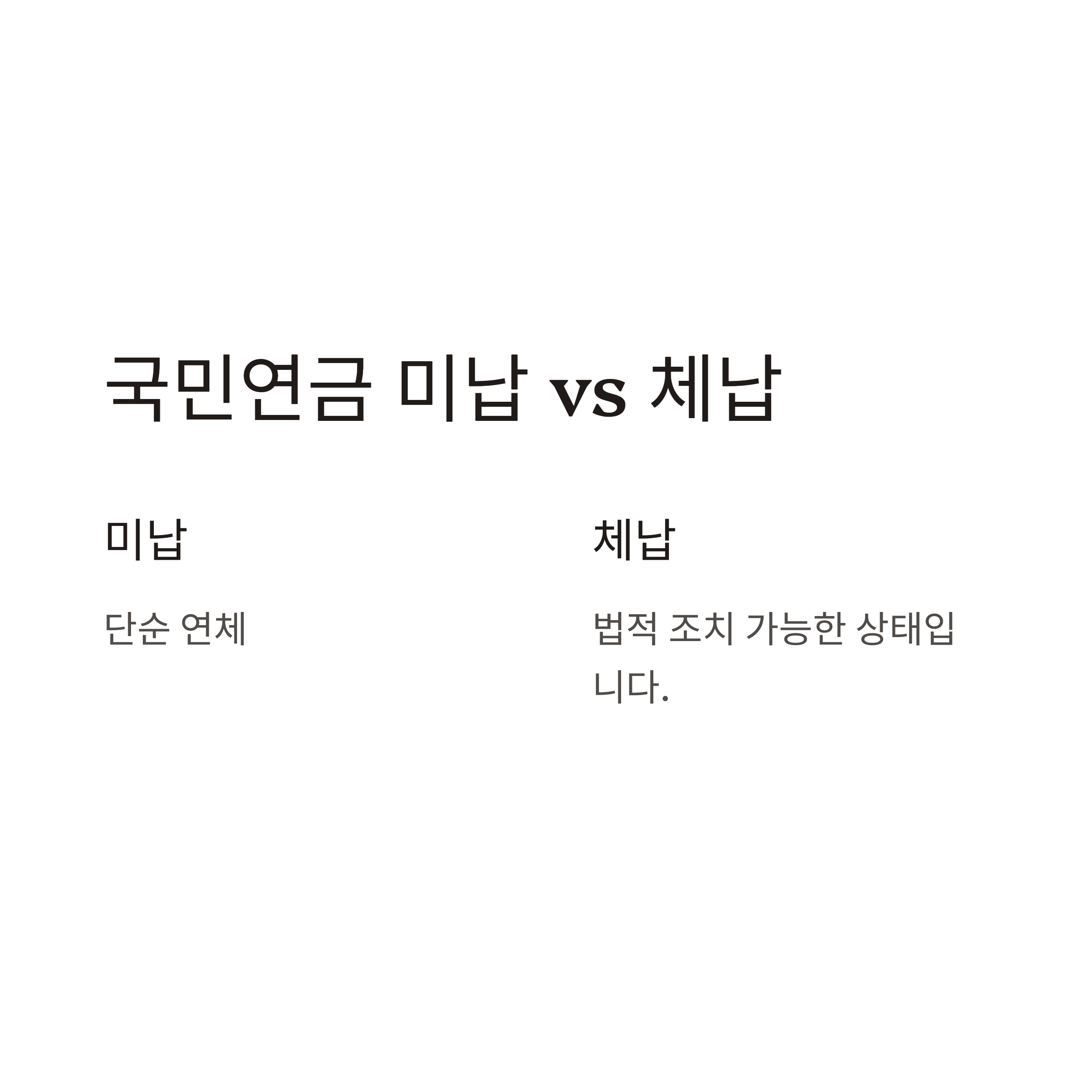 미납은 단순히 납부 기한 내 납부를 하지 않은 상태를 말하고, 체납은 미납 상태가 일정 기간 지속돼 공단에서 독촉·압류 등의 법적 조치를 준비하는 상태로 넘어간 것을 의미합니다.