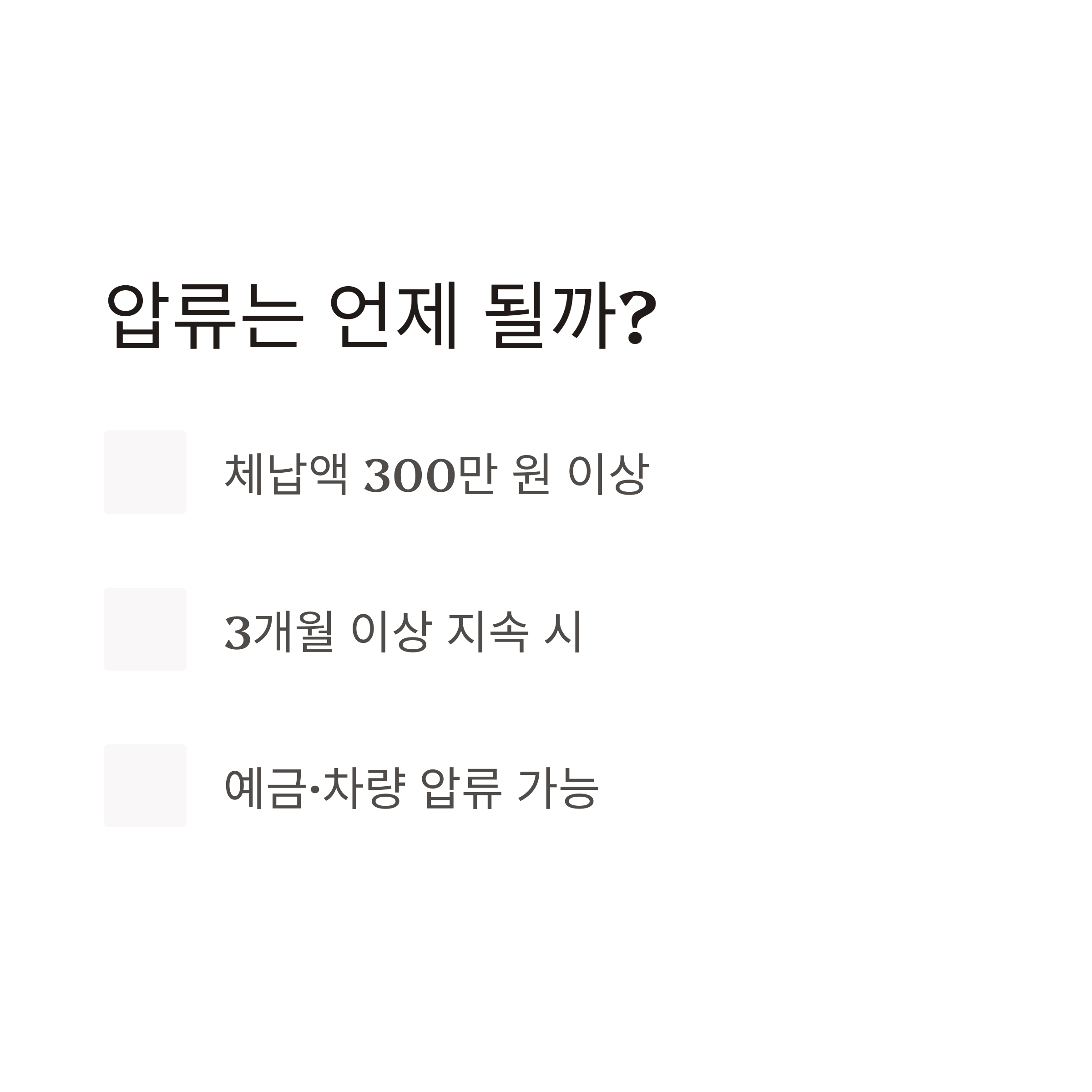 | 체납 상태 | 납기일 초과, 독촉장 발송 이후 압류 가능 |