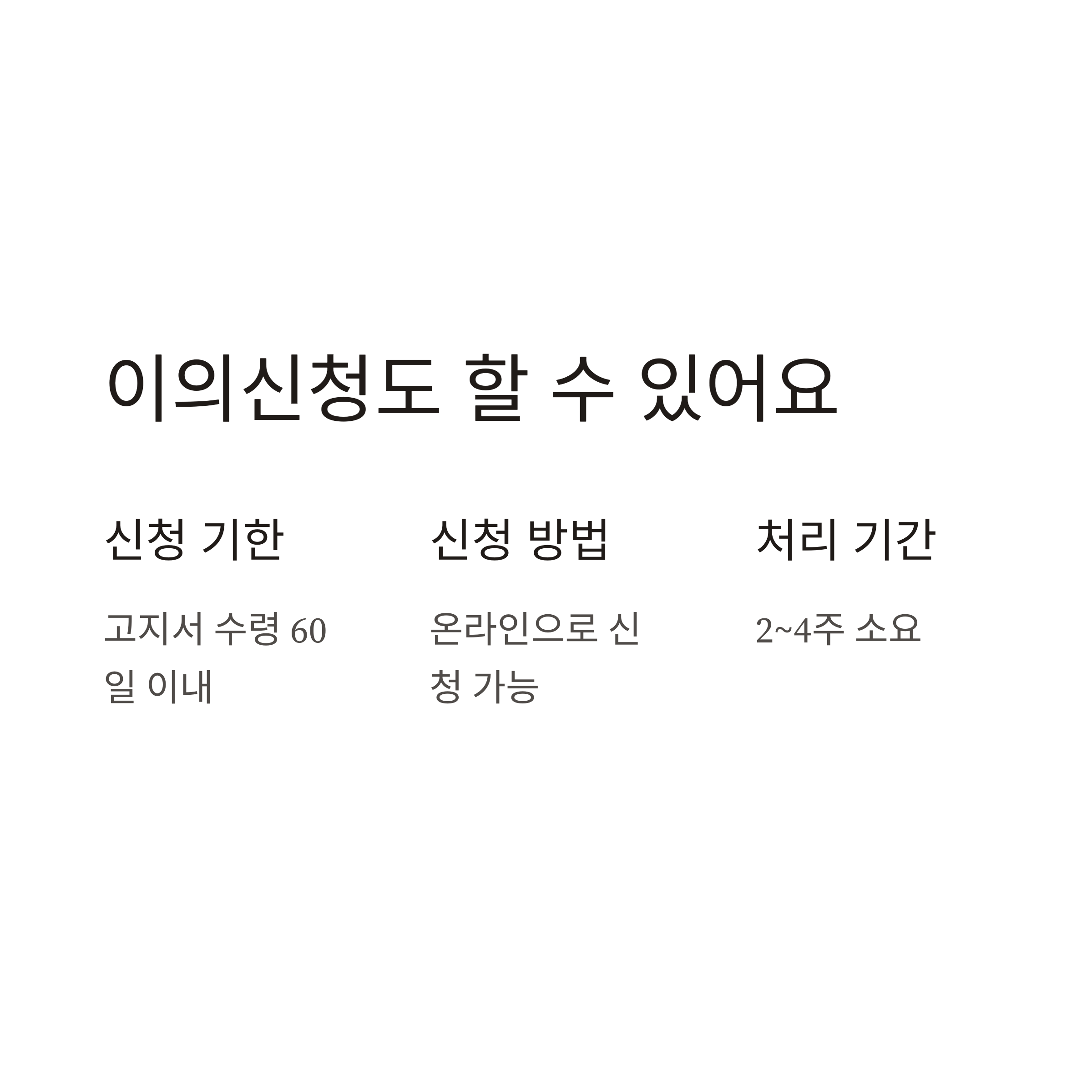 억울하게 체납 통보를 받거나, 이미 납부한 금액이 누락된 경우는 이의신청을 통해 바로잡을 수 있습니다. 저도 예전에 회사에서 납부한 금액이 일부 누락돼 체납자로 등록된 적 있었는데요, 이의신청으로 해결했어요.