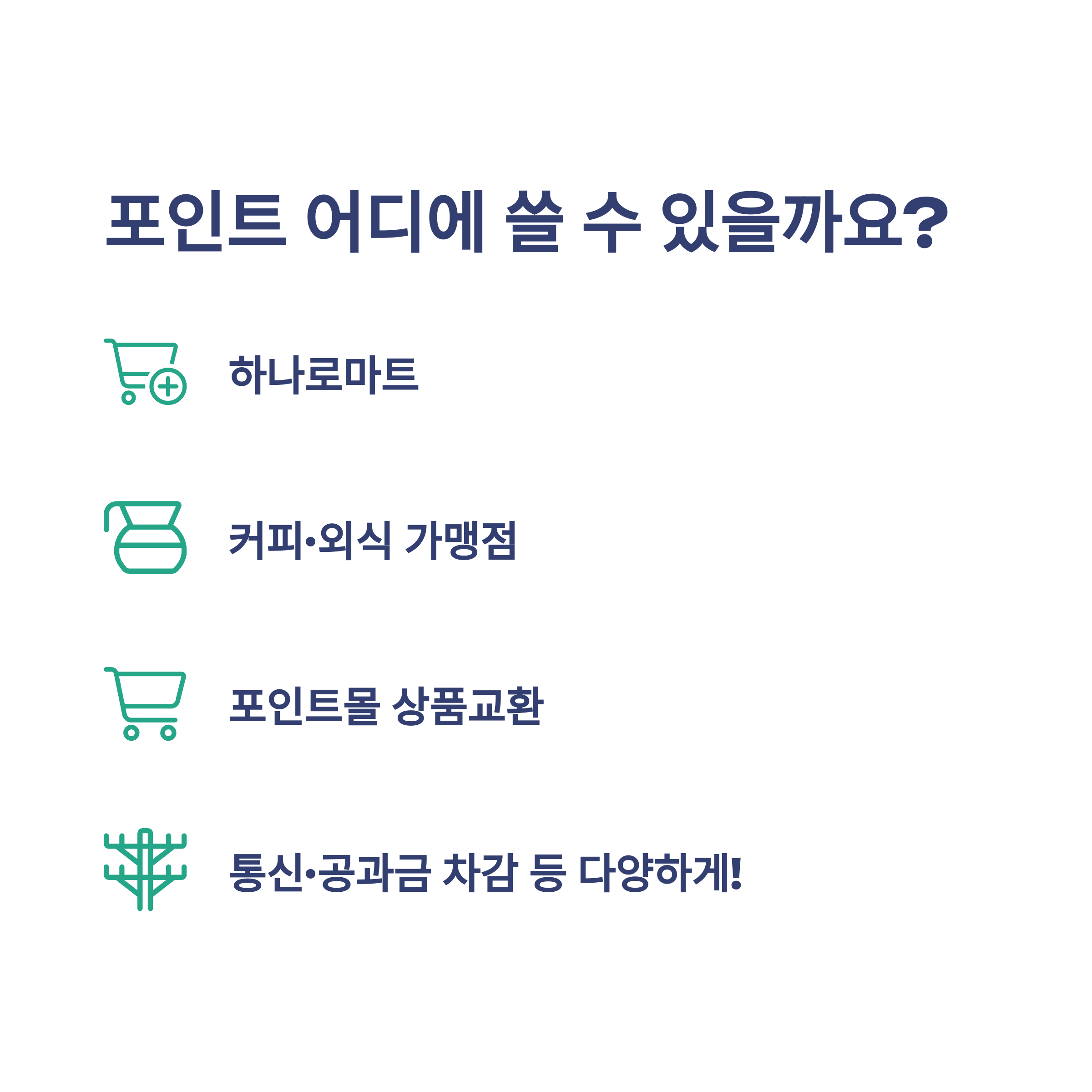 - 영화, 커피, 외식: 지정 가맹점에서 포인트 결제 지원