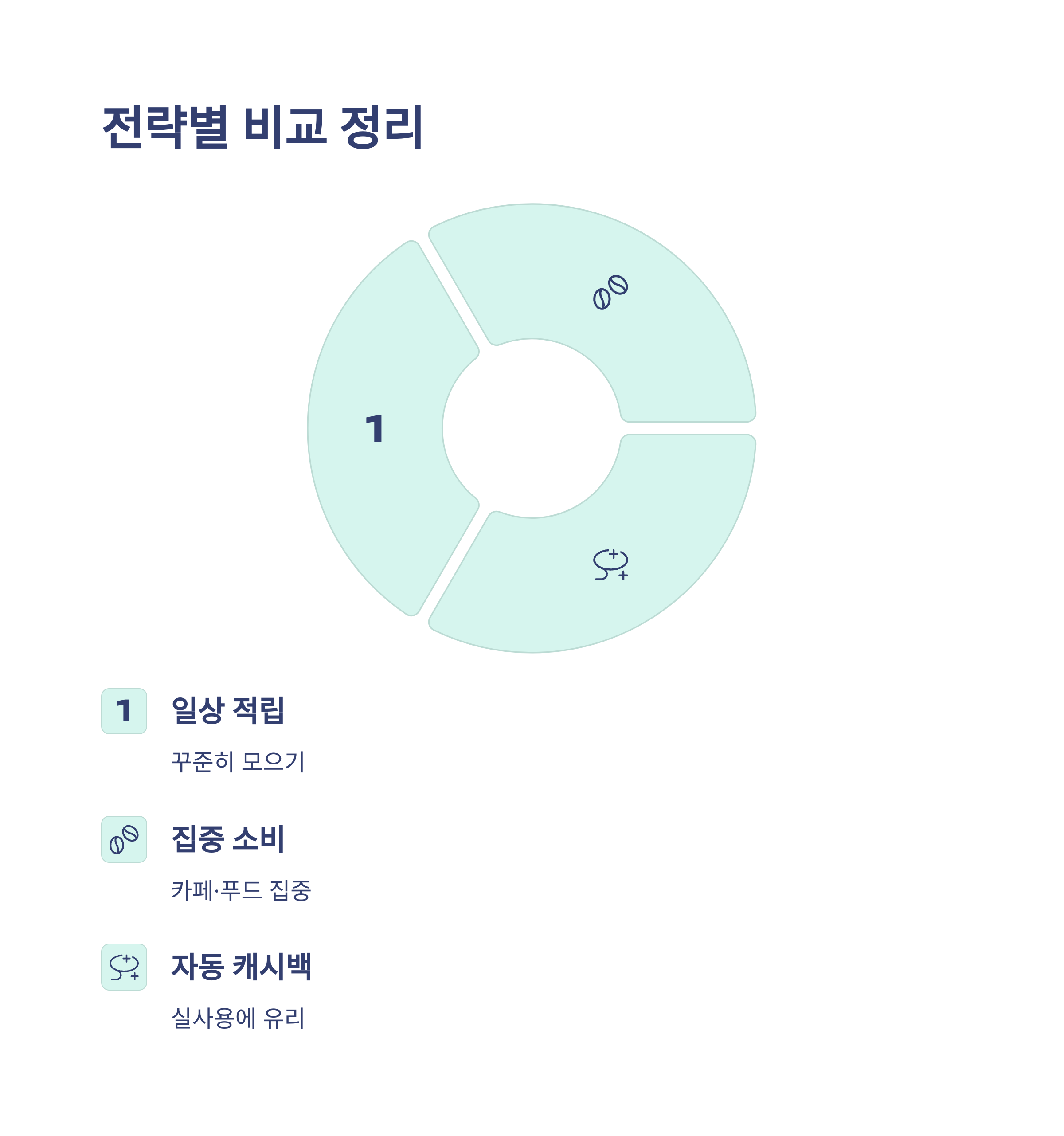| 푸드/쇼핑 집중 사용 | 적립률 높아 단기간 모으기 유리 | 적립 조건과 실적 체크 필수 |