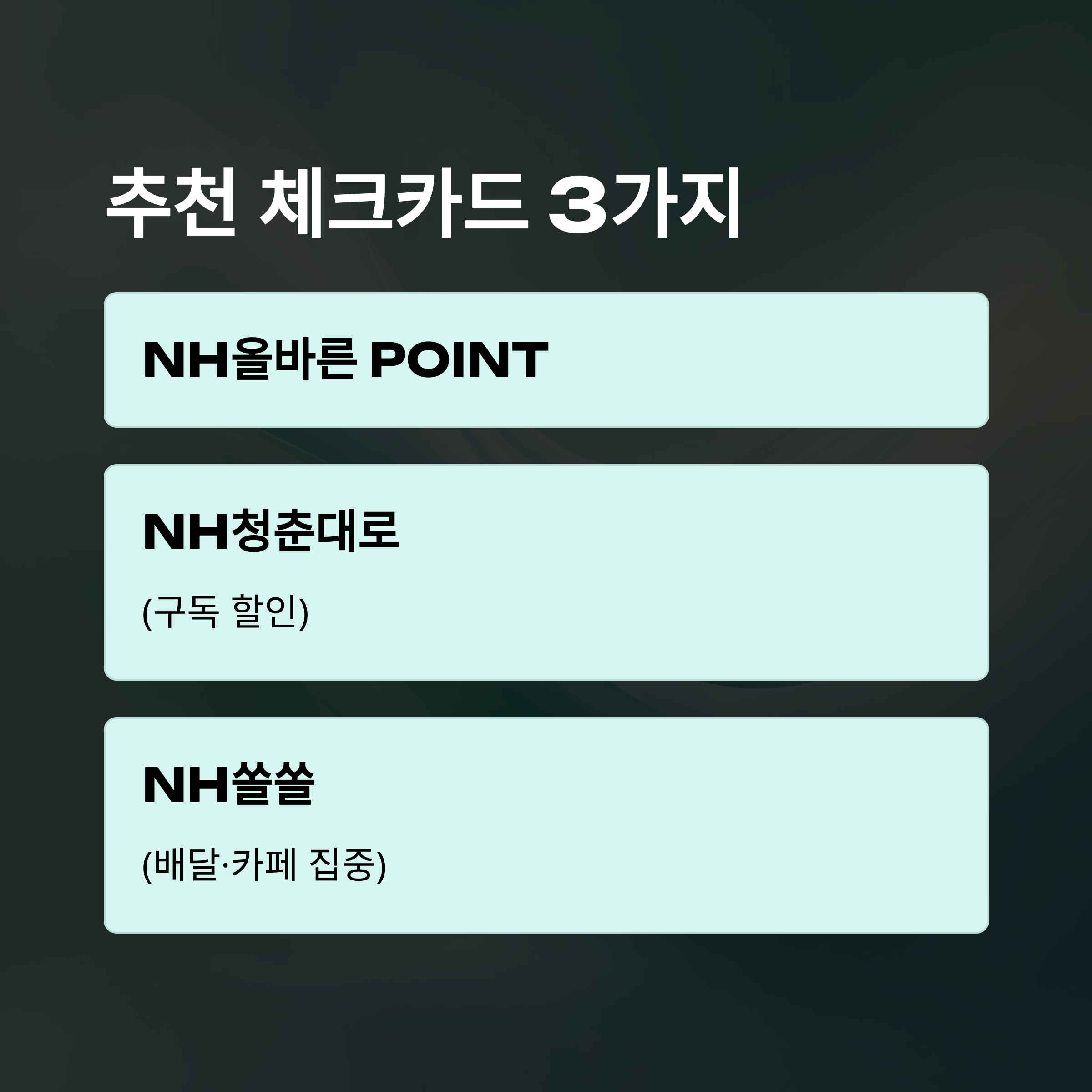 - NH쏠쏠 체크카드 – 배달·커피 등 주력 소비처에 높은 적립률
