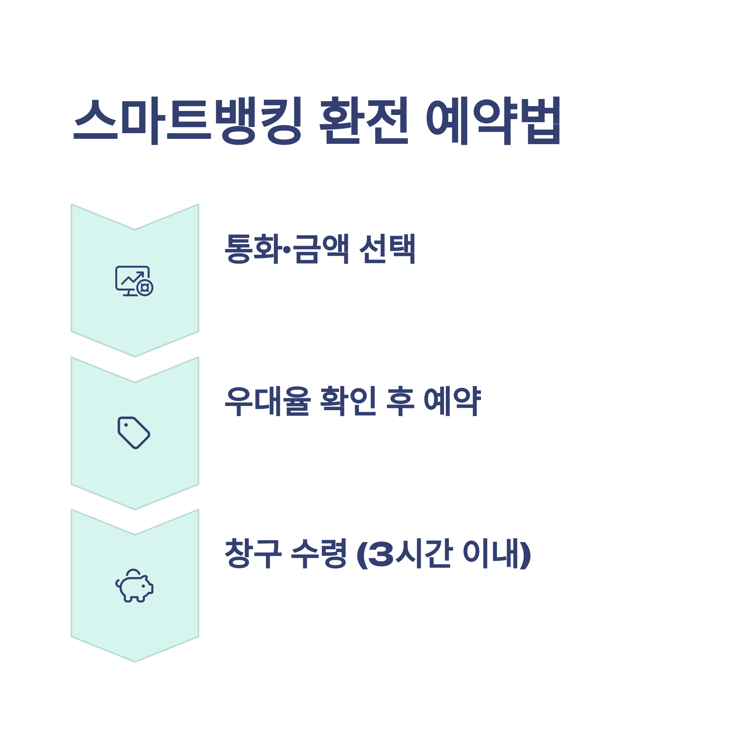 | NH스마트뱅킹/웹 | 환율 확인 → 예약 → 수령까지 스마트 | 예약 후 수령시간 준수 필요 |