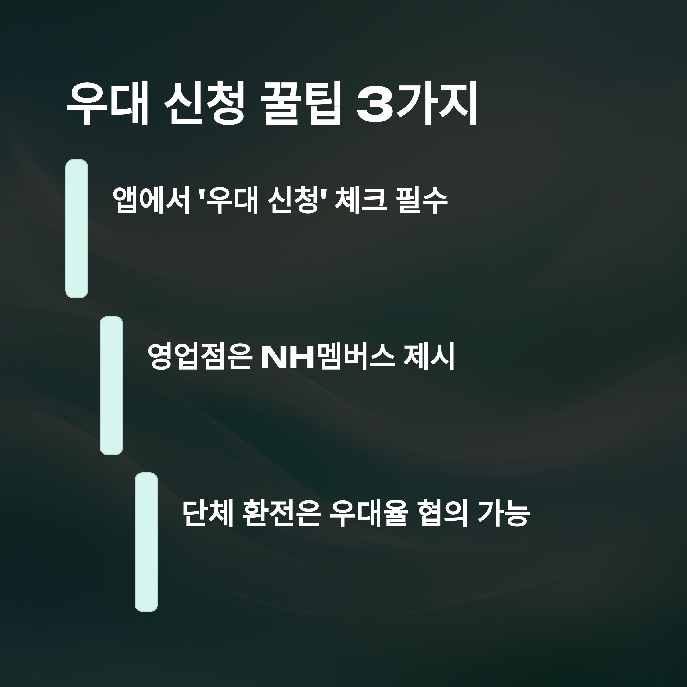 제가 우대 신청 놓쳤다가 1% 우대 못 받아서 1만원 손해 본 적 있어요. 그래서 몇 가지 팁 드립니다: