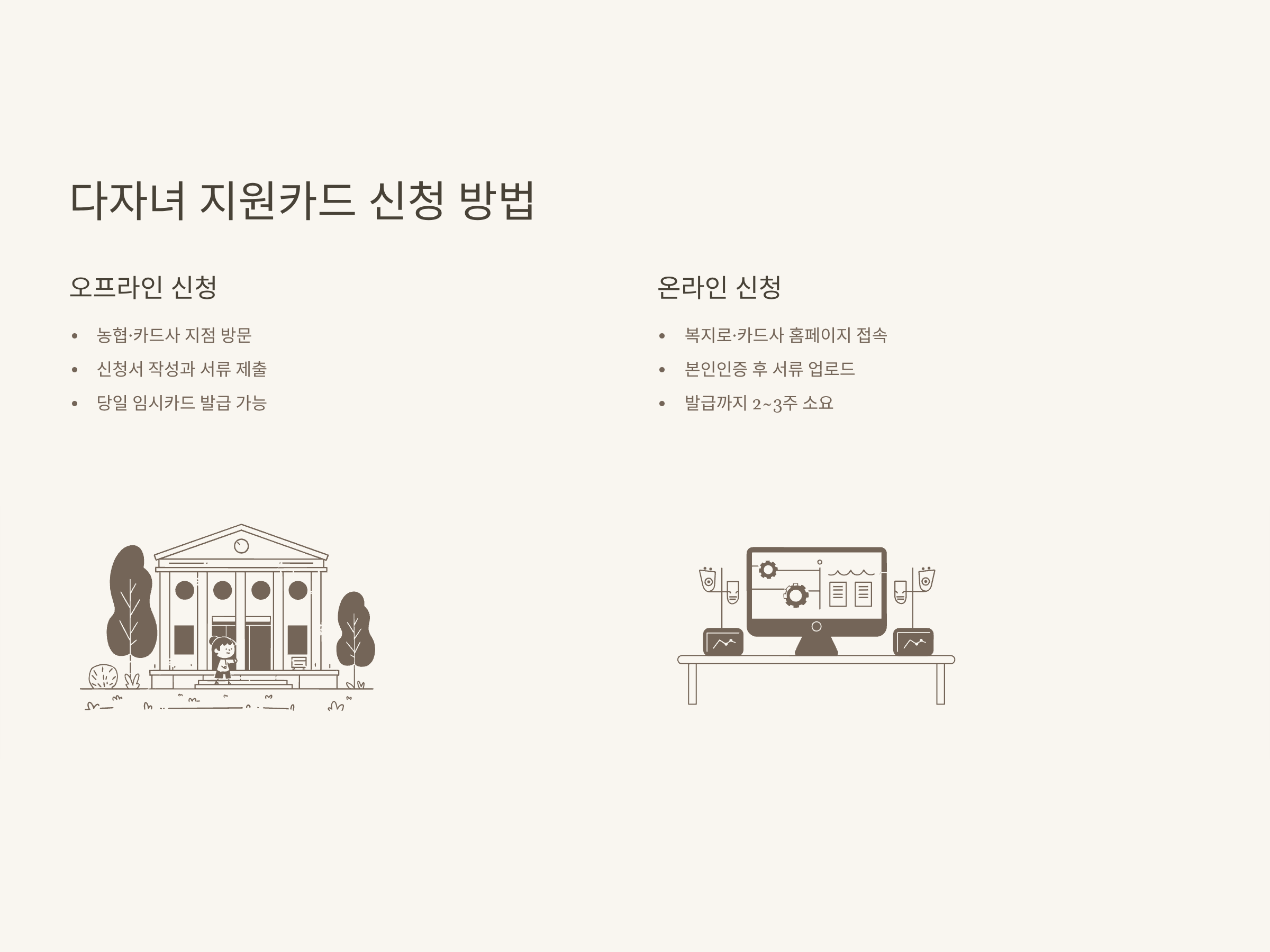 다자녀 지원카드 신청은 생각보다 훨씬 간단합니다. 저는 농협을 직접 방문해서 신청한 경험이 있고, 지인들은 복지로나 각 카드사 홈페이지에서 온라인으로 신청하는 경우도 많았습니다. 실제로 오프라인 방문보다 온라인 신청이 더 빠르고 간편했던 분들도 많으니, 본인 상황에 맞게 선택하시면 됩니다. 신청 방법 요약
