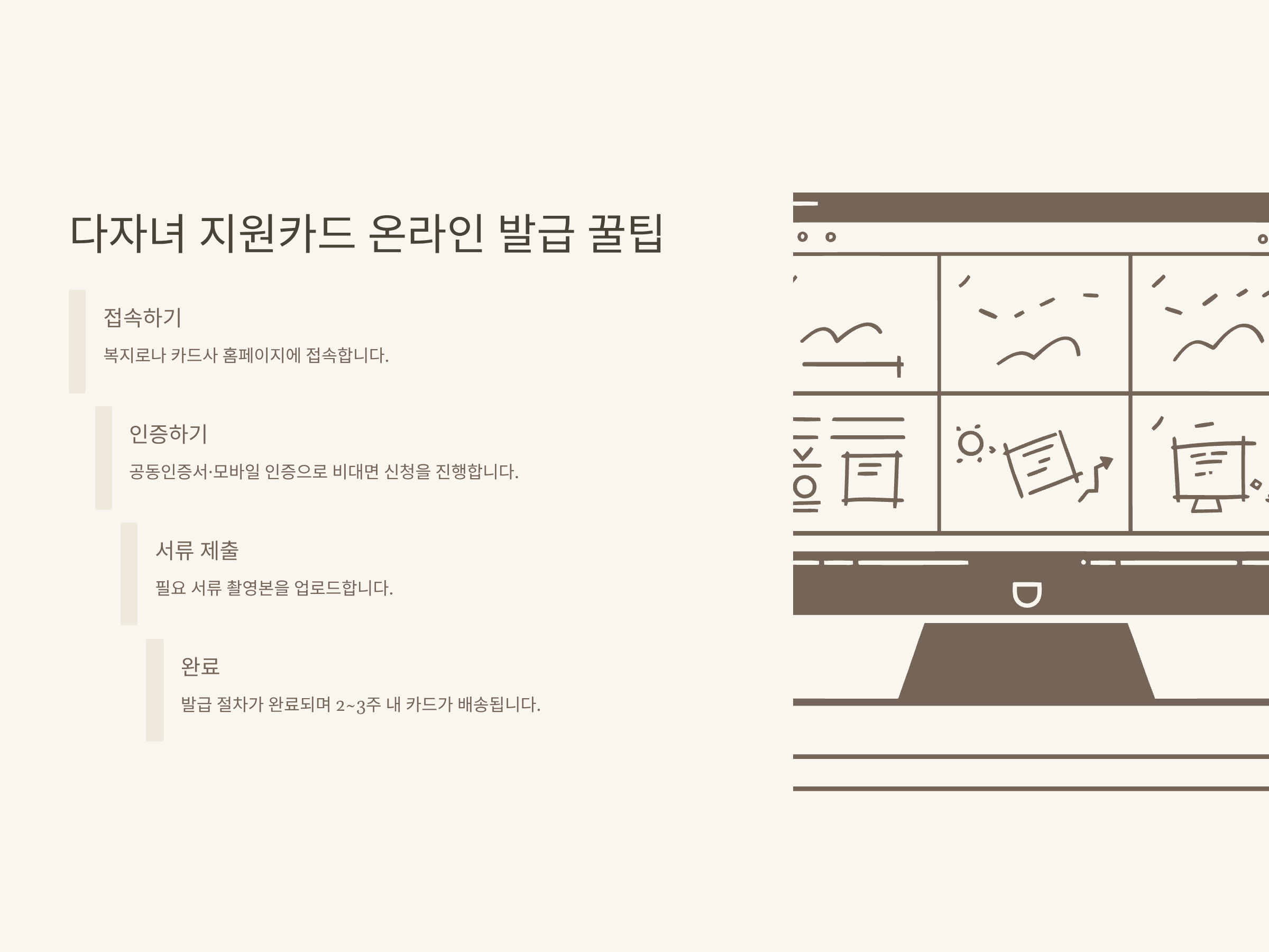 저는 요즘에는 대부분의 복지 신청을 온라인으로 해결하고 있습니다. 다자녀 지원카드도 복지로, 지자체 홈페이지, 농협 등에서 온라인으로 신청할 수 있어서 직접 방문할 필요가 줄었습니다. 특히 서류를 스캔해서 첨부하거나 모바일 인증만 거치면 되는 경우가 많아, 시간·교통비 절약에 정말 큰 도움이 됐어요. 온라인 발급 시 유의점 및 팁