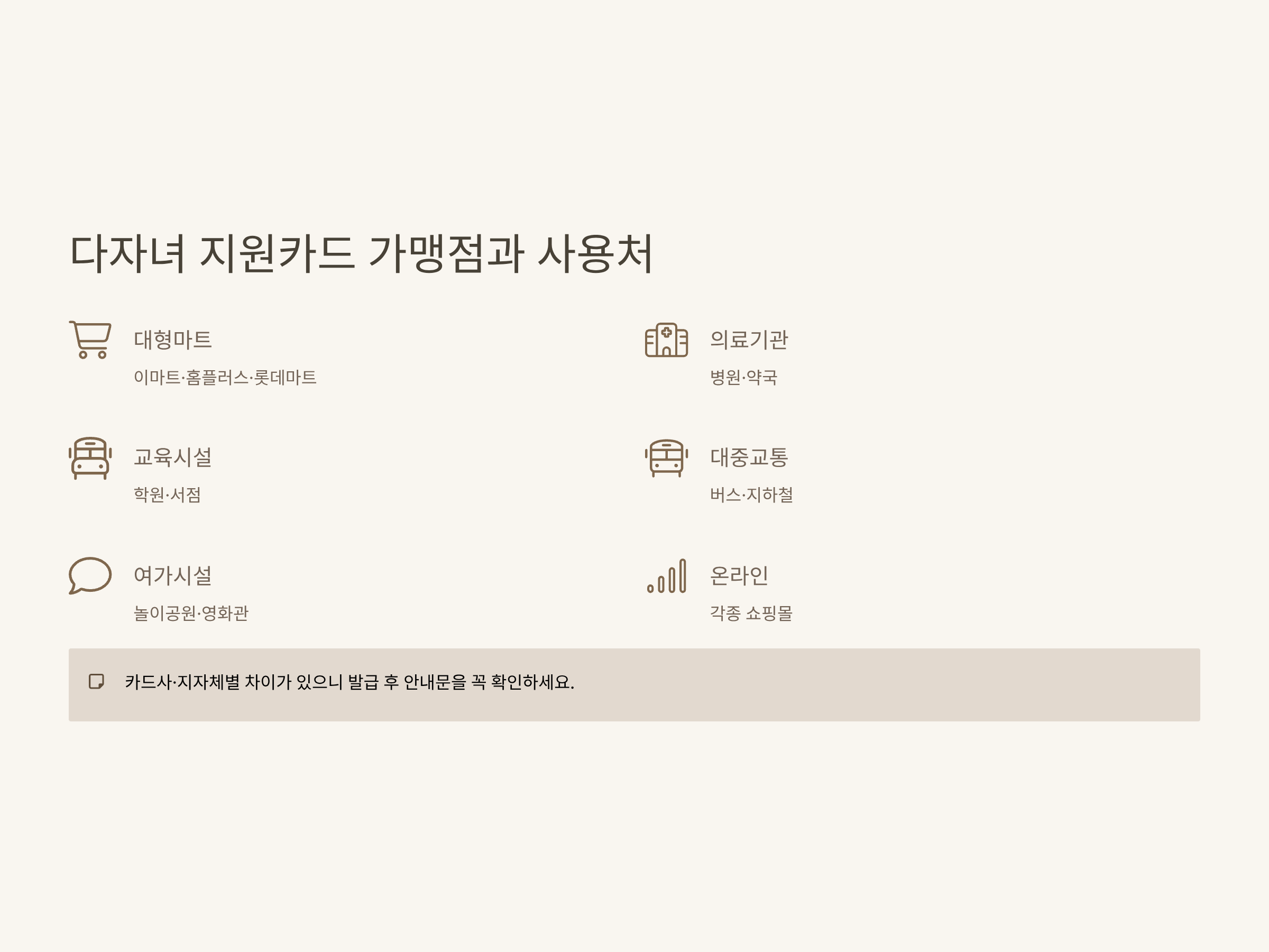 | 지원카드 명칭 | 다자녀 지원카드, 행복카드, 가족사랑카드 등 지역별 상이 |