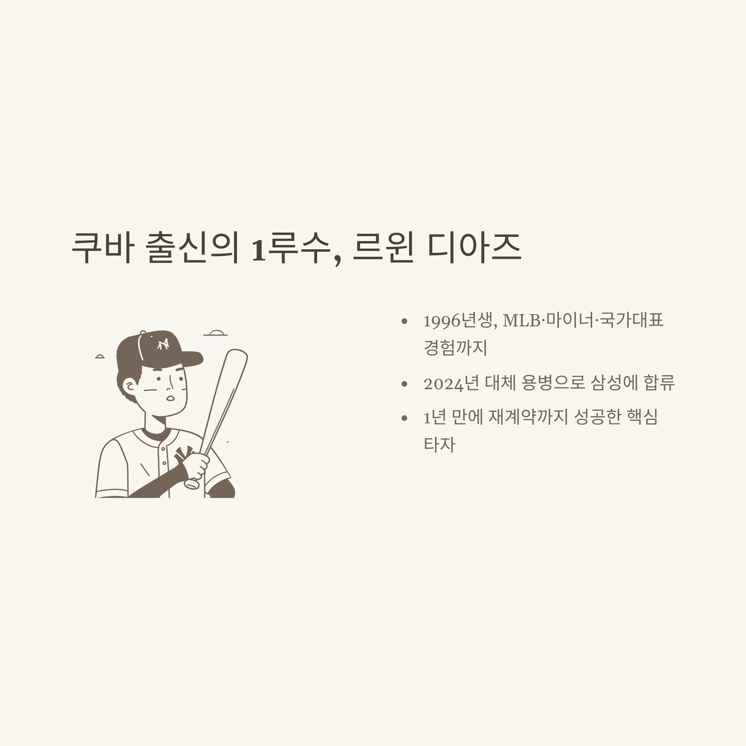 디아즈 르윈(LEWIN DIAZ)은 1996년생, 쿠바 출신의 좌타 1루수로 2024년부터 삼성 라이온즈에서 활약 중입니다. 저도 처음엔 MLB에서도 여러 팀을 전전한 선수라 큰 기대가 없었지만, 실제 KBO에 와서 보여준 파워와 타격 집중력은 확실히 인상적이었어요. 2024년에는 대체 외국인 선수로 입단, 한 시즌 만에 재계약을 따내며 2025시즌에도 삼성 중심 타선의 핵심 역할을 맡고 있습니다. 미국 마이너리그, 메이저리그(볼티모어 오리올스, 마이애미 말린스 등)에서 쌓은 경험이 그대로 KBO에서 녹아든 모습입니다.