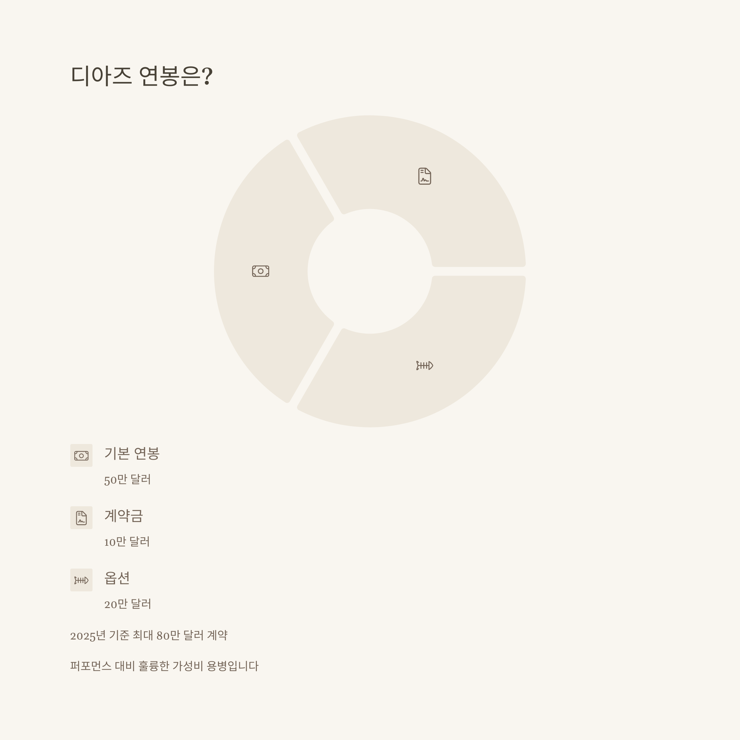 | 2025년 연봉 | 최대 80만 달러 (연봉+옵션+계약금) |