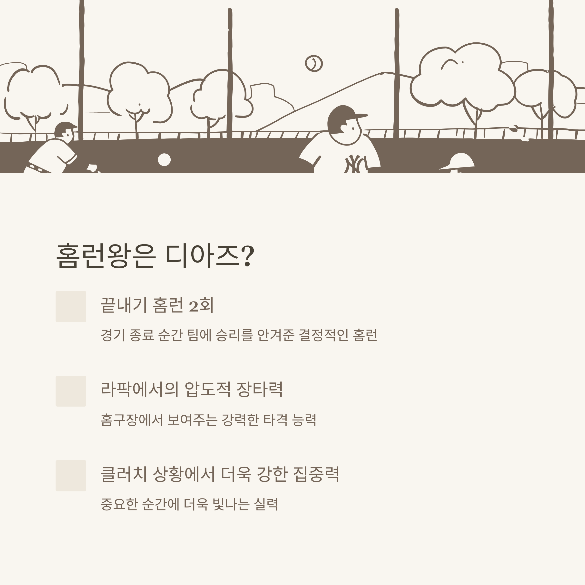 제가 직접 라팍 현장에서 직관했던 경험을 바탕으로 말씀드리면, 디아즈의 타구 속도와 각도는 확실히 KBO 용병 평균 이상입니다. 물론 한두 경기는 침묵할 때도 있는데, 집중력 있게 지켜보면 “이제 나오겠지?” 싶은 순간 한 번에 해 주더라고요. 특히 5월과 6월에 보여준 몰아치기 홈런, 끝내기 장면은 팬들에겐 오래 기억에 남을 명장면이었어요.