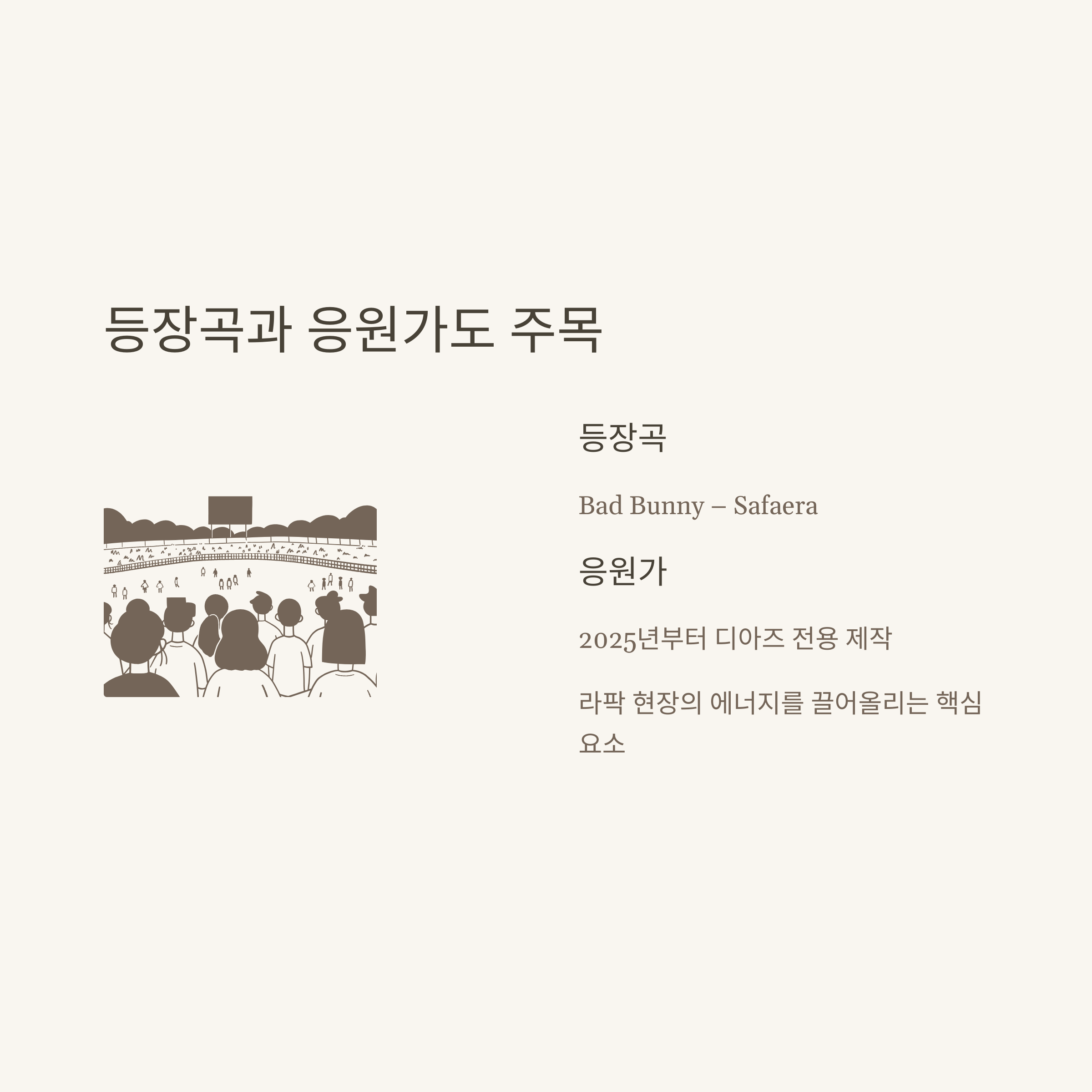 디아즈의 등장곡은 라틴음악 느낌이 강한 “Safaera(바드 버니)”로, 라팍에서 등장할 때마다 묘하게 에너지가 느껴집니다. 삼성 팬들 사이에선 “이 곡 나오면 뭔가 터질 것 같다”는 농담도 돌 정도입니다. 응원가는 기존 용병 응원가의 라인을 따르다가, 2025년부터 디아즈 개인 응원가가 따로 만들어져 홈 팬들 사이에서 빠르게 퍼졌습니다. 저도 몇 번 따라 불러봤는데, “디!아!즈!”가 반복되는 부분에서 정말 짜릿해지더라고요.