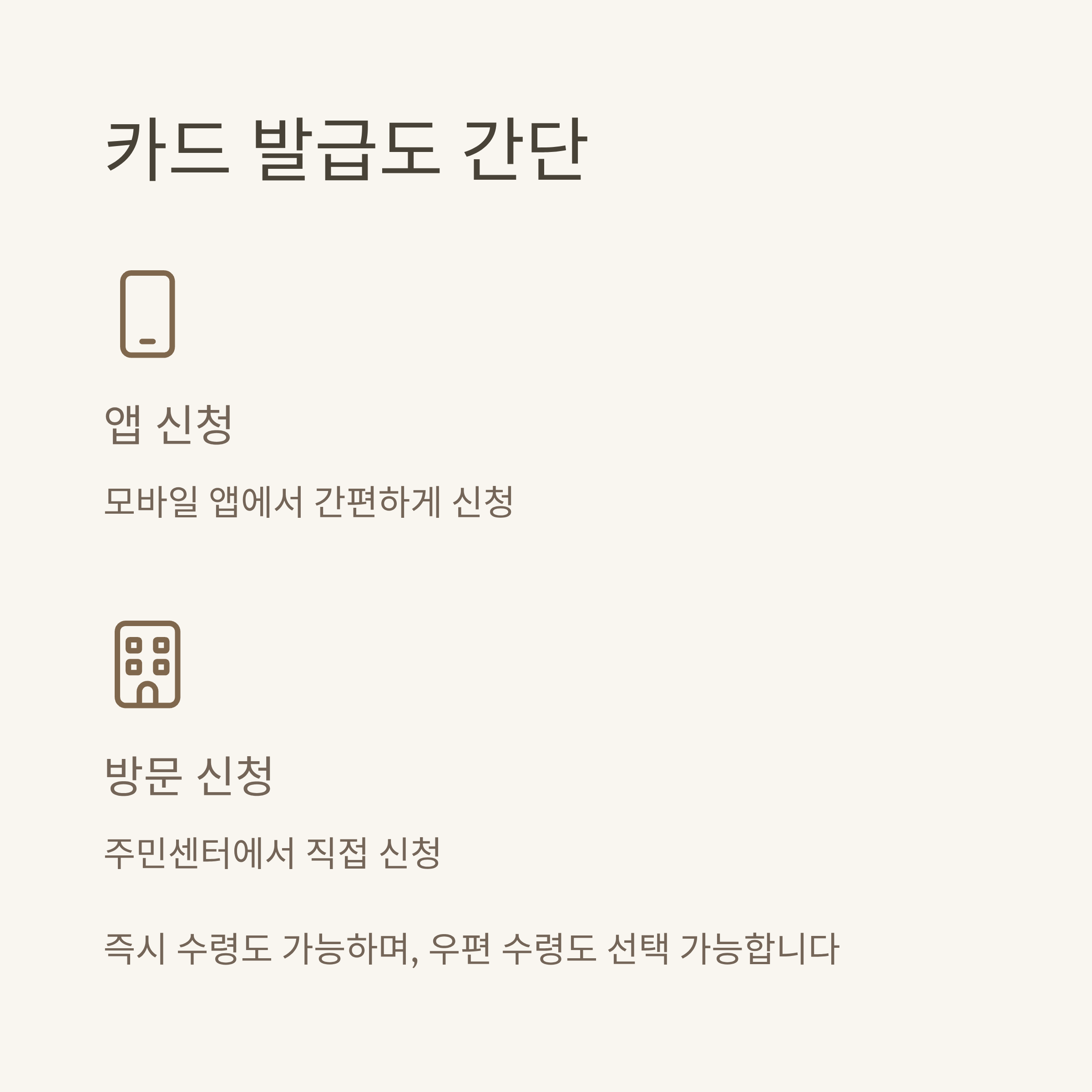 또한, 주민센터 방문을 통한 카드형 신청도 가능합니다. 신분증을 지참해 거주지 관할 주민센터에 방문하면 즉시 카드 발급을 받을 수 있으며, 대리인 신청도 가능합니다. 만약 방문이 어려운 경우 ‘찾아가는 신청 서비스’를 요청할 수 있어 편리했습니다.