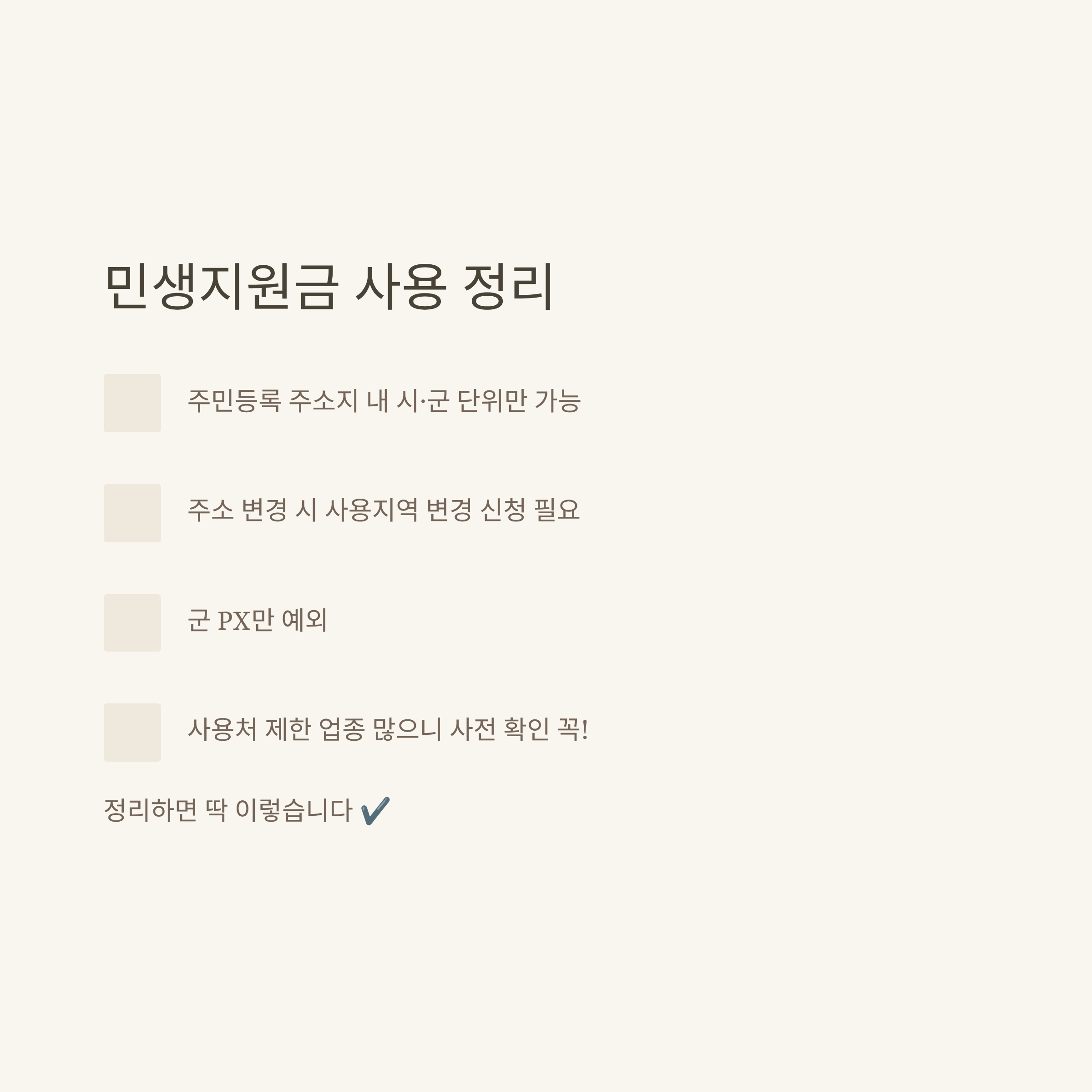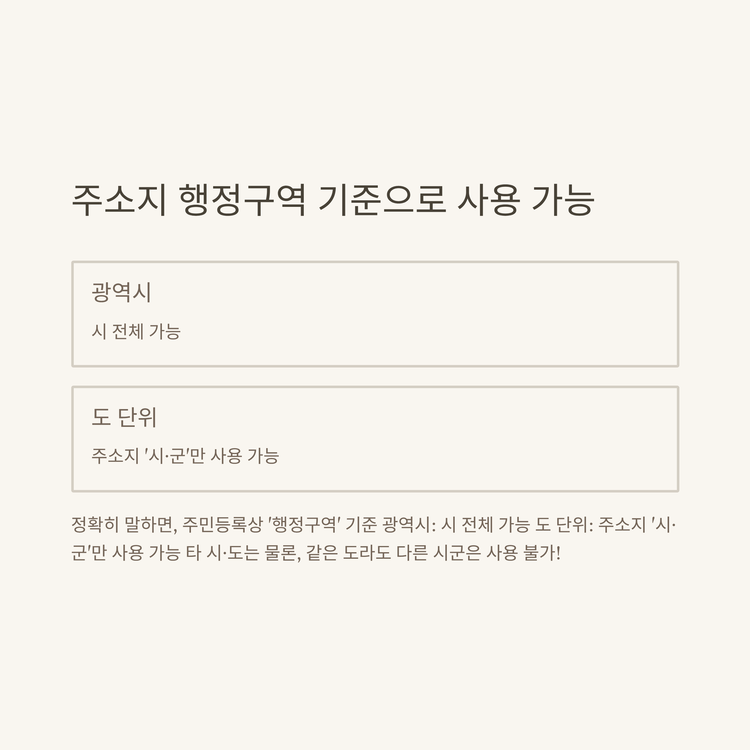 신청 기준은 반드시 주민등록 주소지이기 때문에, 만약 신청 직전 전입·전출을 했다면 최신 행정정보로 반영되는지를 꼭 확인해야 합니다. 도 단위 지역에 거주하는 분들은 '도 전체'가 아닌 '주소지 시·군'에서만 사용 가능합니다.