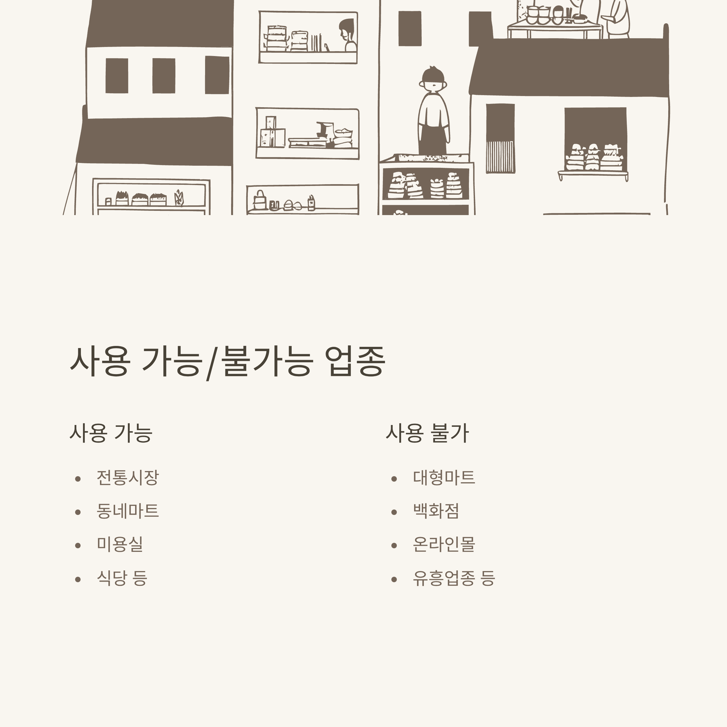또한, 대형마트, 백화점, 전자제품점 등 대기업 유통점이나 면세점, 온라인쇼핑몰, 유흥업소, 환금성 업종 등에서는 어디서든 사용이 제한되어 실제로 동네 소상공인 위주로만 결제 승인이 이뤄집니다.