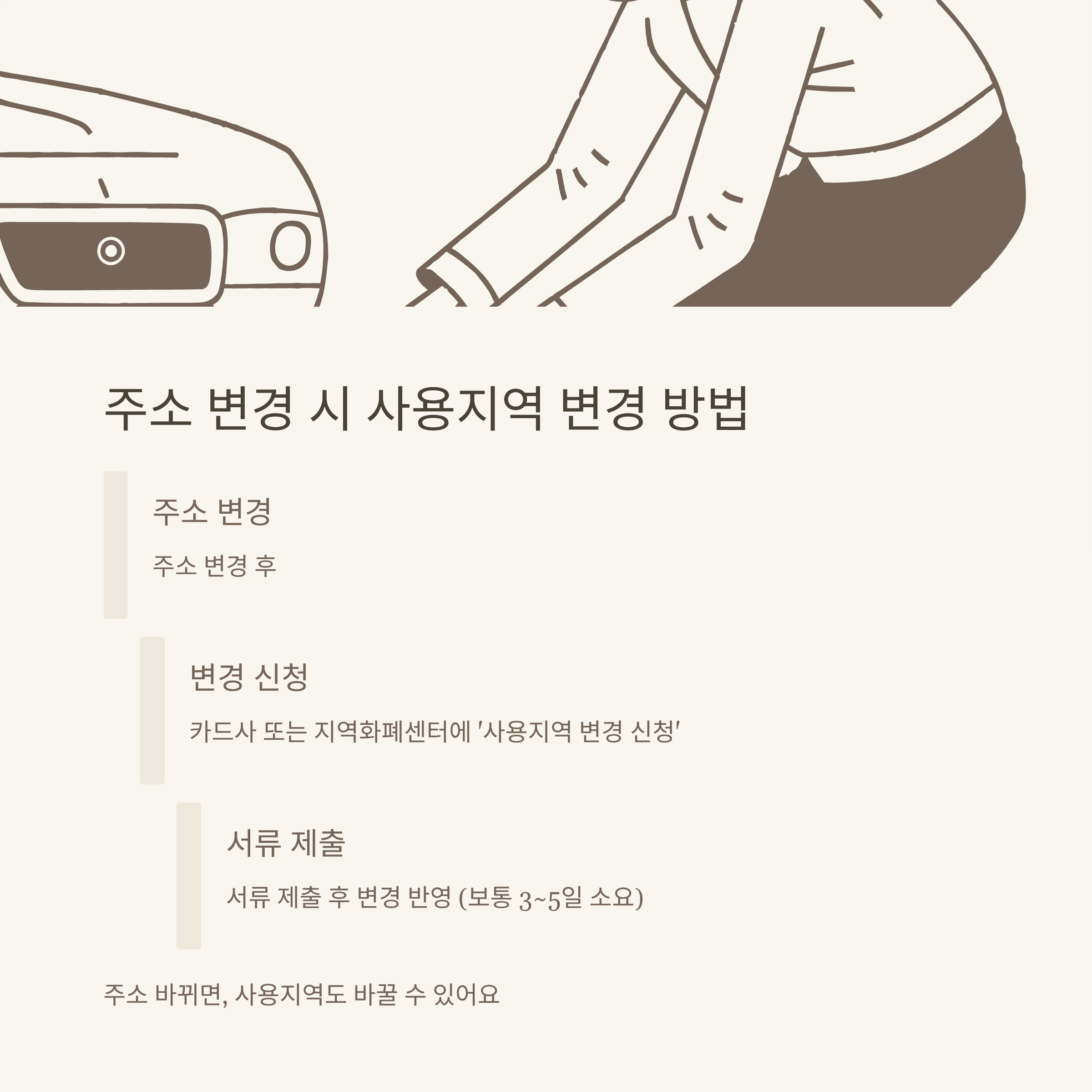 | 사용지역 변경 | 주소 변경 시 카드사 및 지역화폐 앱에 변경 신청 필요 |