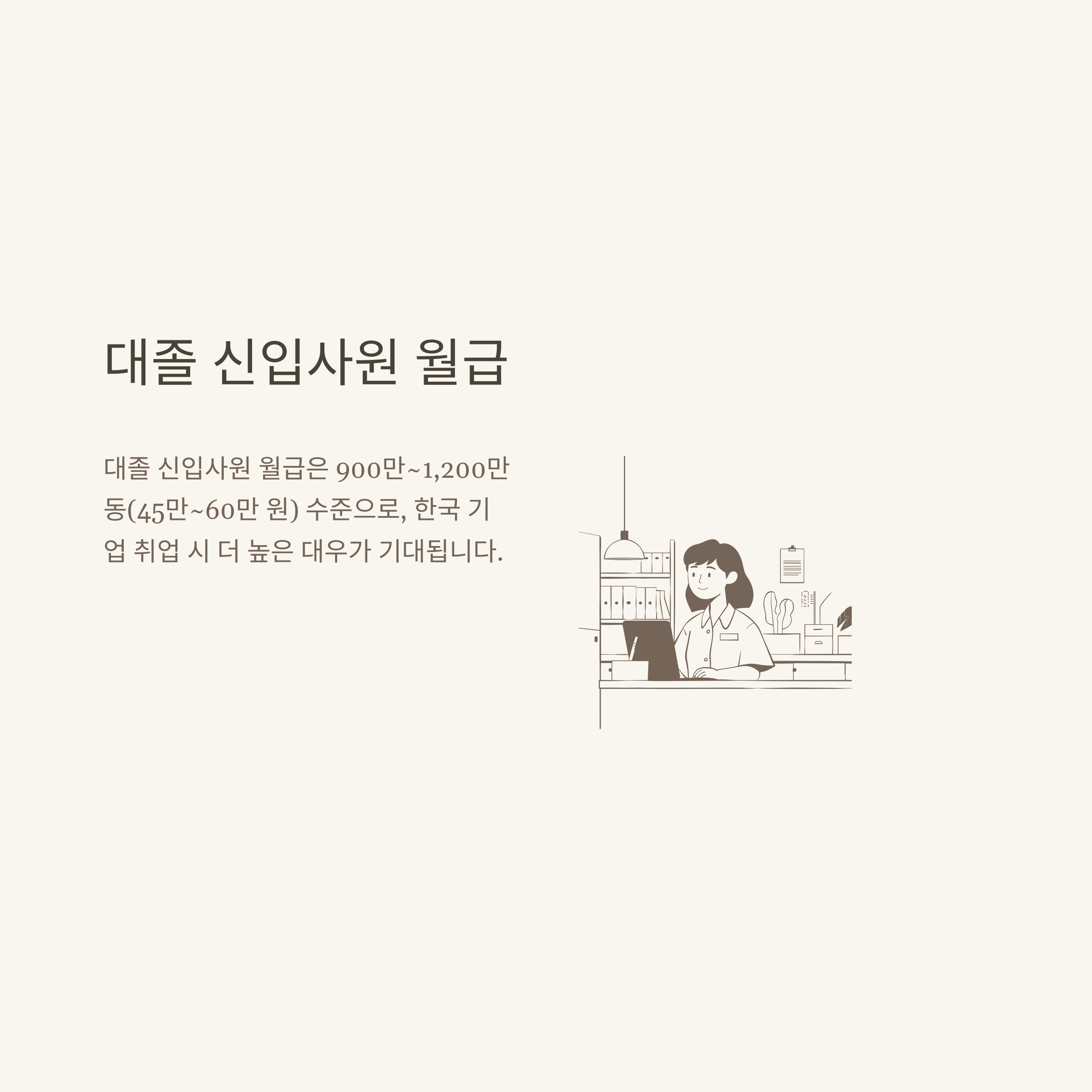 | 대졸자 신입 월급 | 45만 원 ~ 60만 원 | 한국 기업 취업 시 우대 |