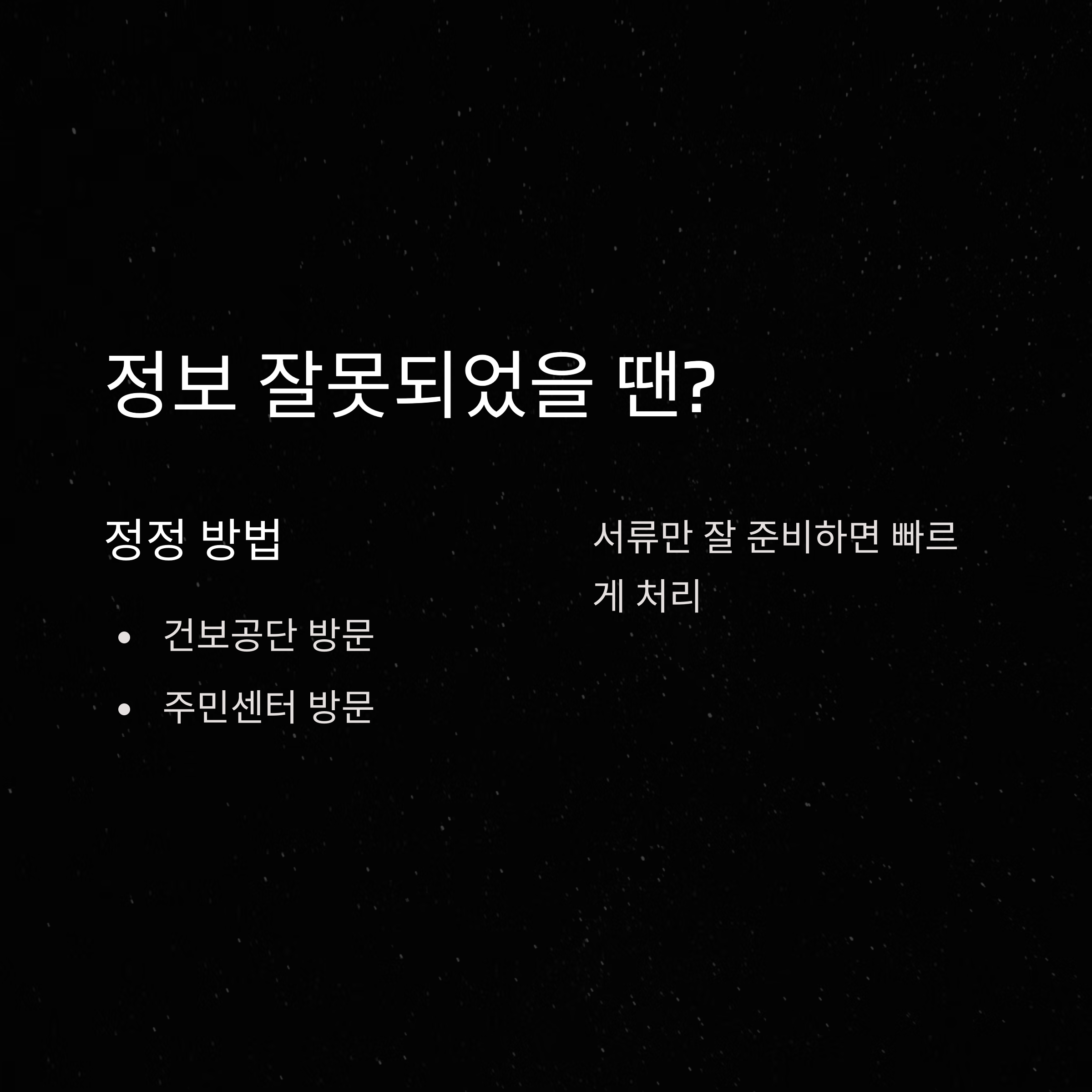 A. 국민건강보험공단이나 주민센터를 통해 빠르게 정정 신청을 하면 됩니다.