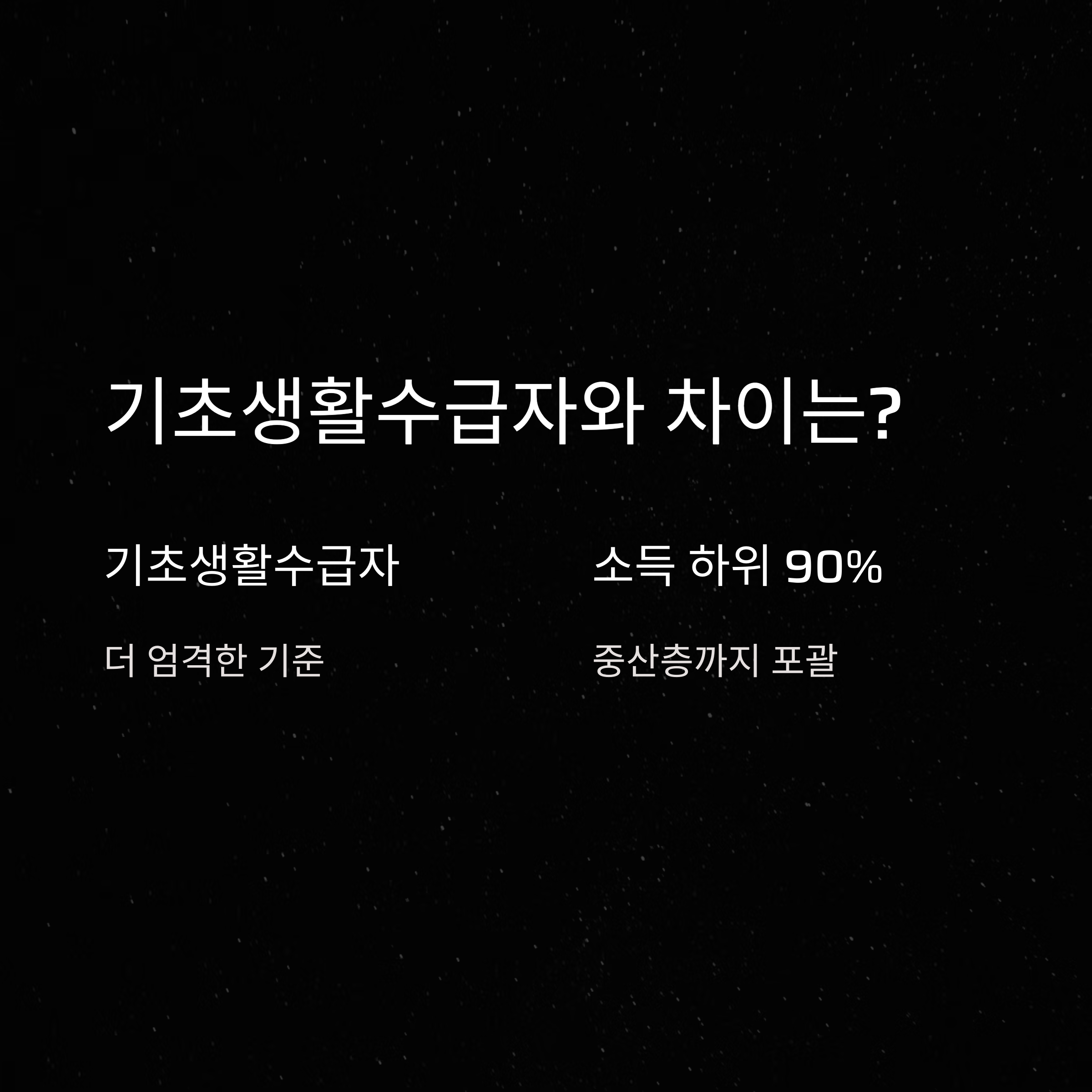 - 소득 하위 90%: 상위 10% 소득자를 제외한 중산층까지 넓게 지원하는 기준으로 재산보다는 소득 중심입니다.