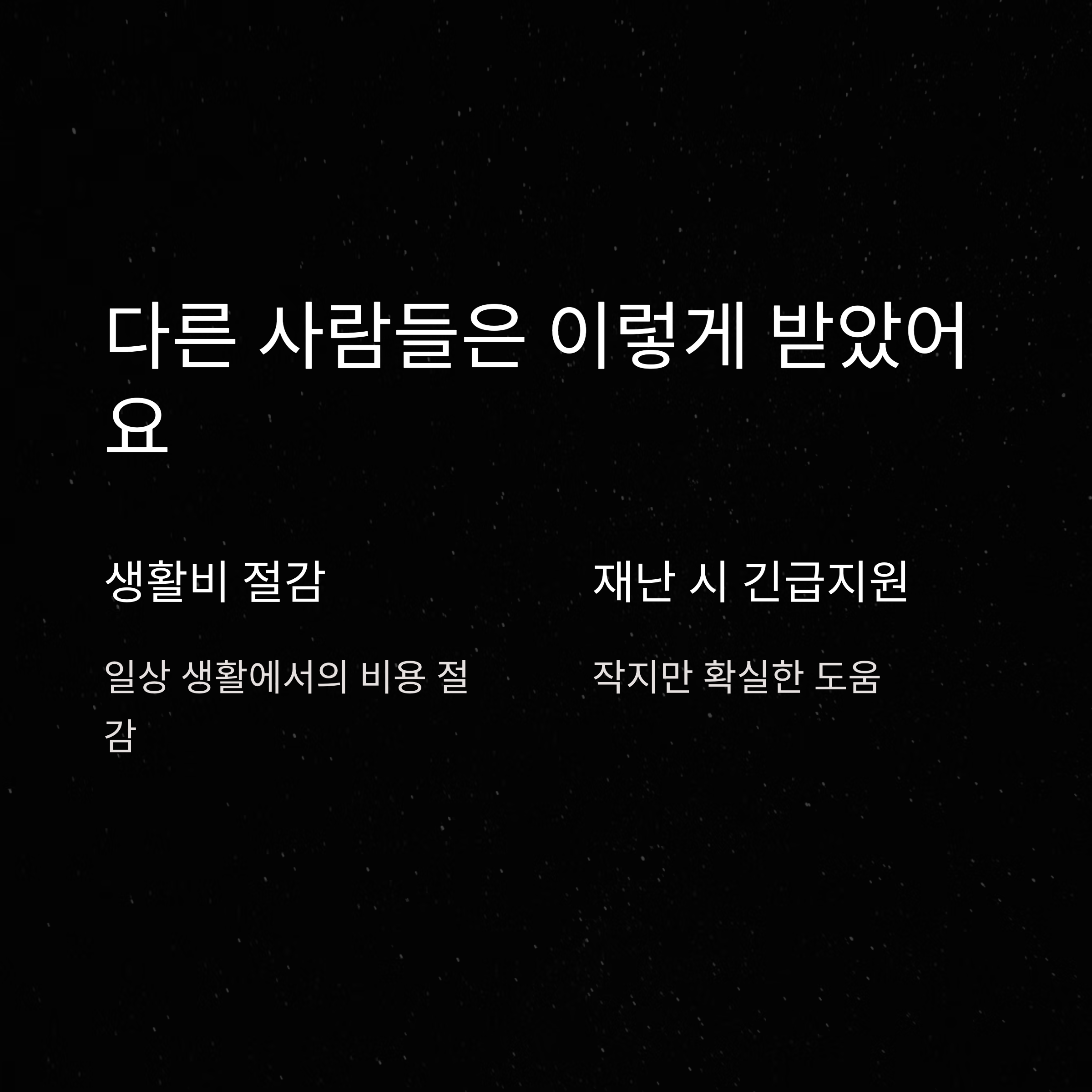 - 긴급생활지원금: 갑작스러운 재난 상황에서 4인 가구 기준 100만 원의 지원금을 받아 급한 생활비를 해결할 수 있었습니다.