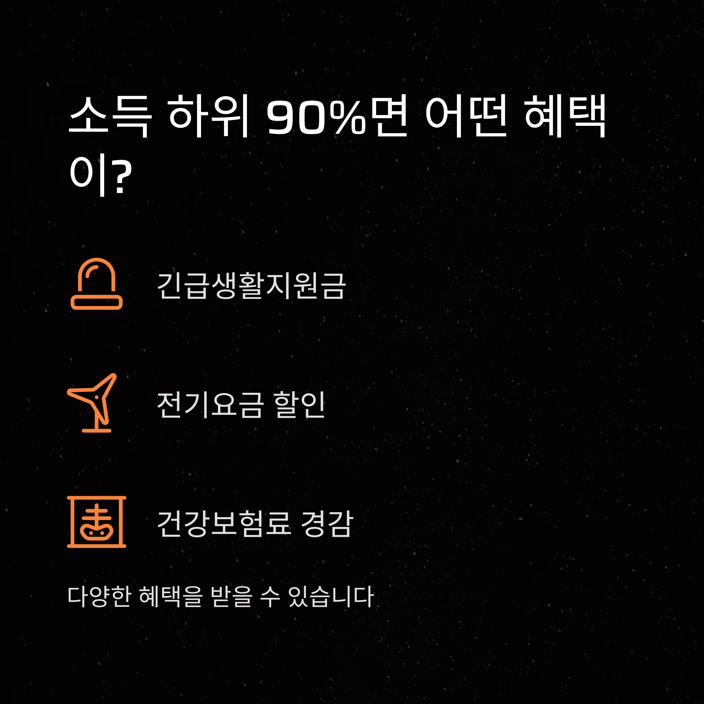 → 다릅니다. 기초생활수급자는 더 엄격한 소득과 재산 기준이 있습니다. - 소득하위 90프로 혜택은 어떤 게 있나요?