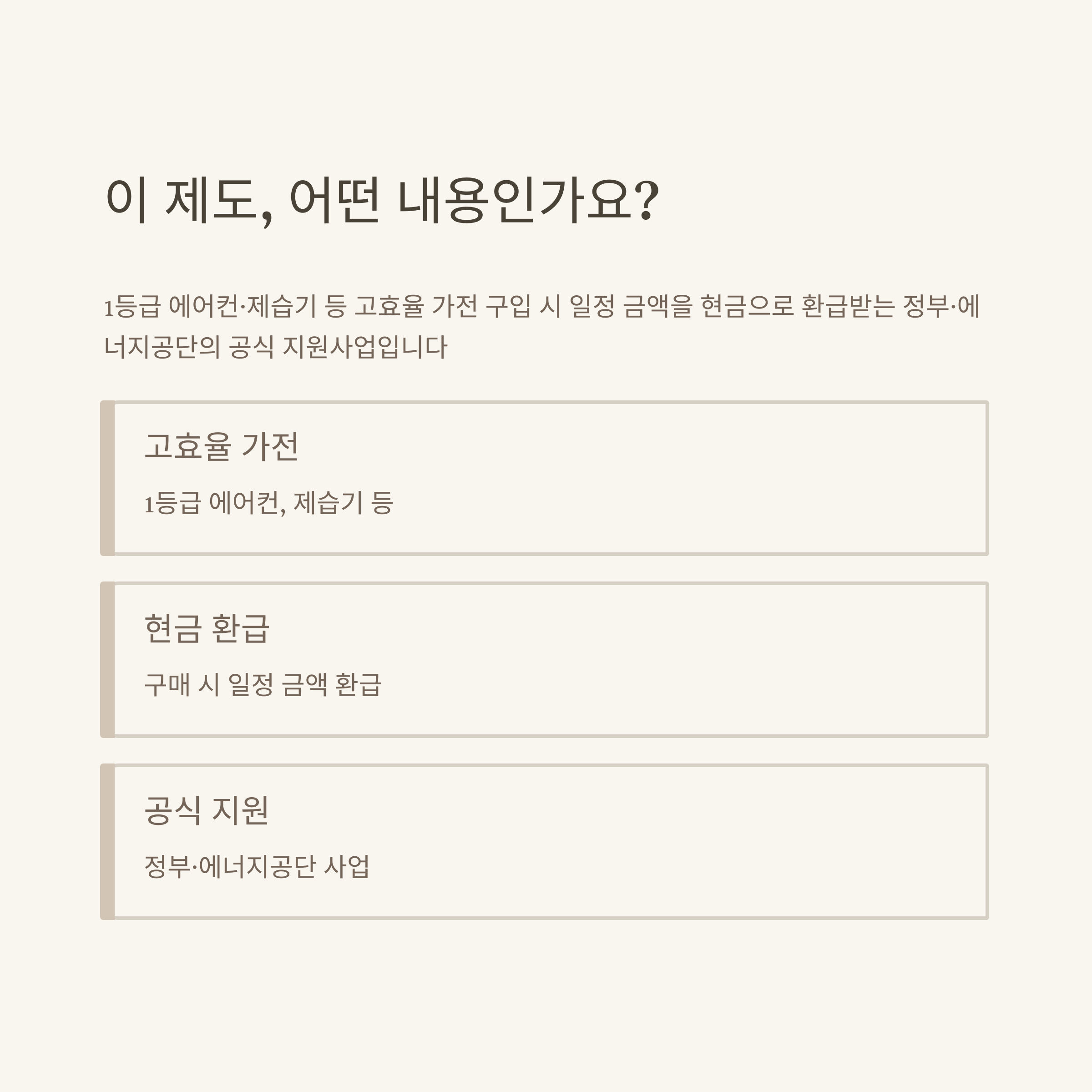 특히 에어컨, 제습기, 냉장고 등 주요 고효율 가전제품이 대상이고, 정부·한국에너지공단에서 매년 예산을 배정해 전국 소상공인이 신청할 수 있습니다. 구매 후 온라인으로 간단히 신청하면 1~2개월 내에 지원금이 계좌로 입금되는 구조라 접근성이 정말 좋았습니다.