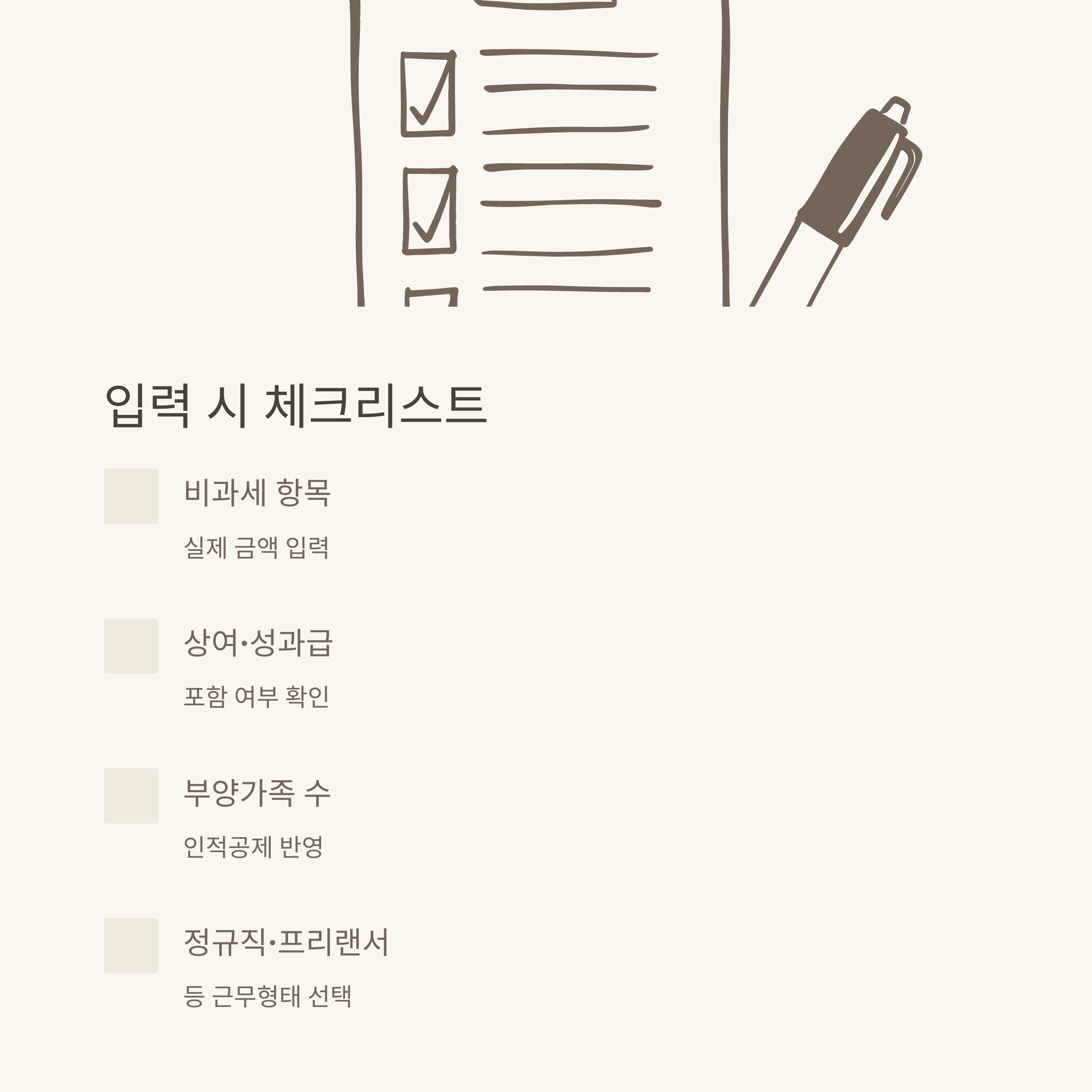 또한 계산 후 결과가 ‘생각보다 너무 적다’면 대부분 공제 항목을 빠뜨렸거나, 반대로 비과세를 과하게 입력한 경우가 많아요. 특히 비과세 항목은 연 240만 원 한도까지만 인정되므로 이 부분도 꼭 체크하셔야 합니다. 비과세 항목 공제 기준 보기