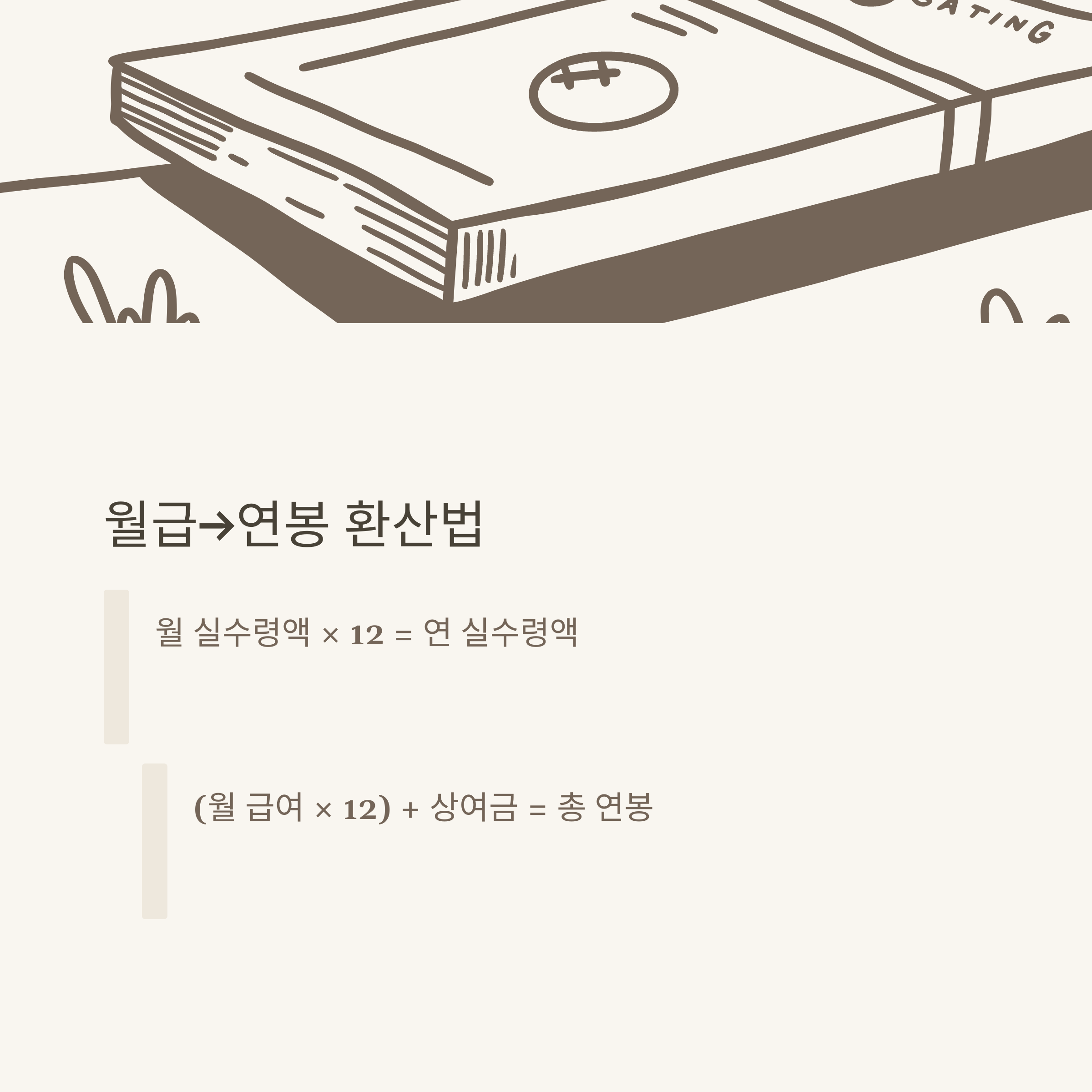 - 월 급여 × 12 + 상여금 = 총 연봉