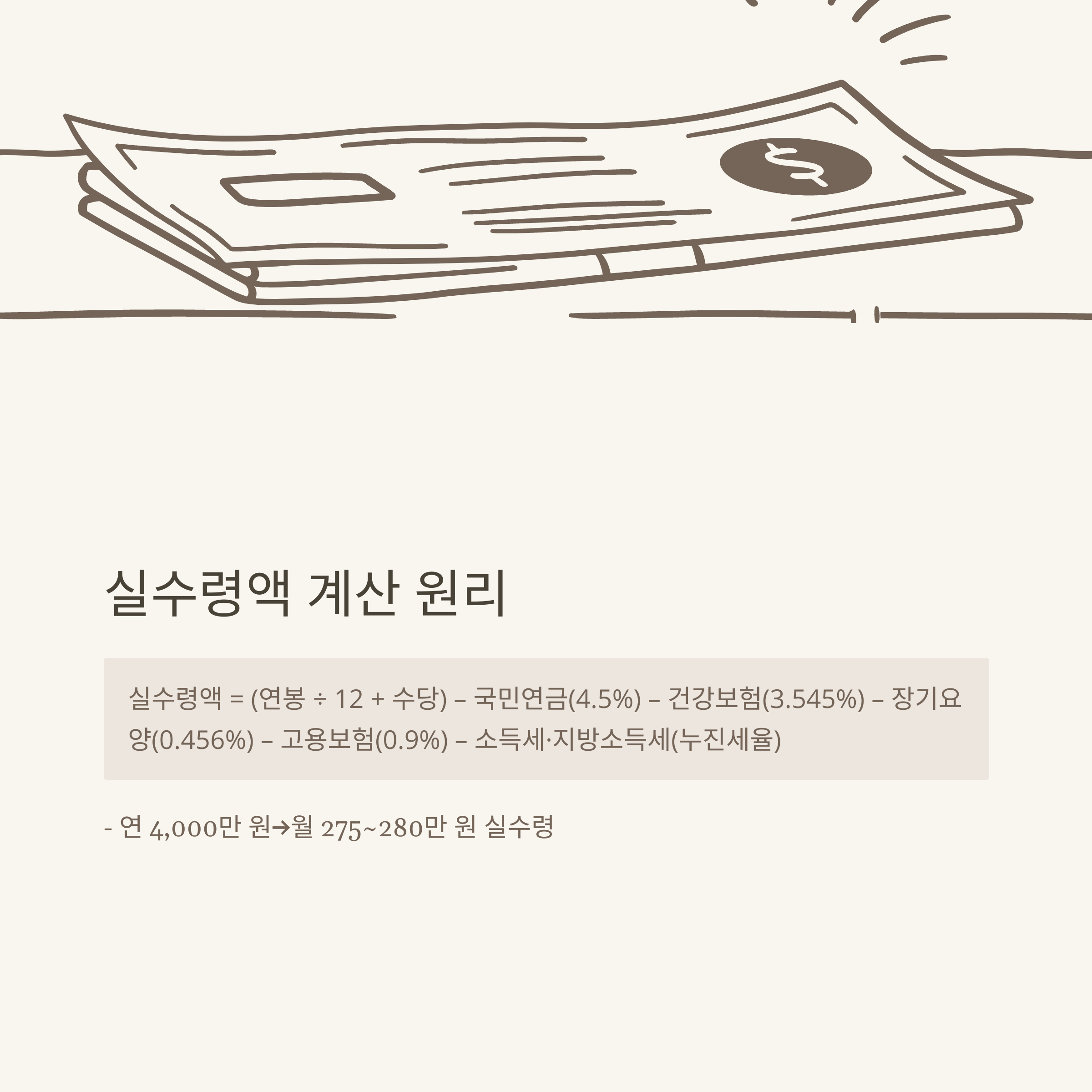 예를 들어 연봉 4,000만 원인 경우, 세후 월 실수령액은 약 275만~280만 원 수준이었습니다. 이건 제가 실제로 4대 보험과 세금이 모두 포함된 급여명세서를 보고 직접 계산해본 수치예요. 참고로 회사마다 비과세 항목이 어떻게 적용되는지에 따라 실수령액은 조금씩 달라질 수 있으니, 반드시 본인 상황에 맞춰 계산하는 것이 중요합니다. 국세청 소득세율표 바로가기