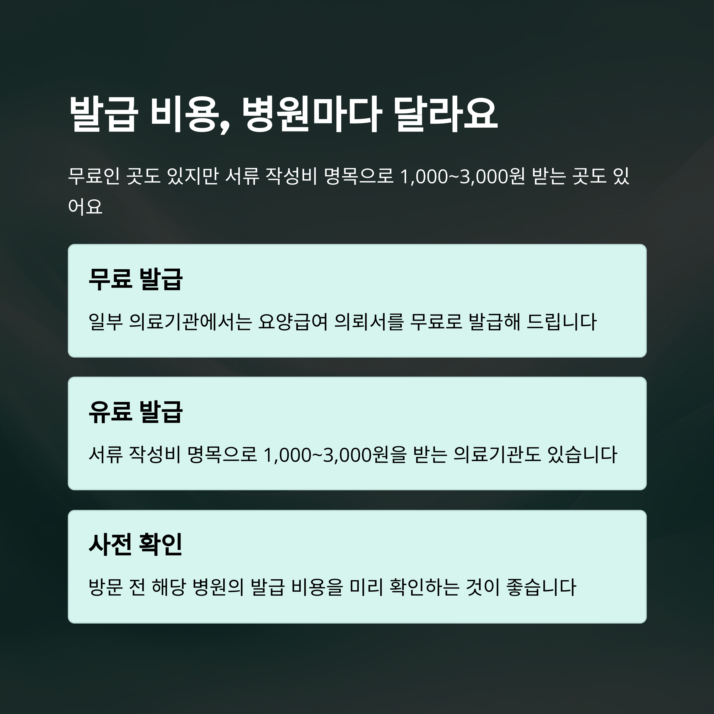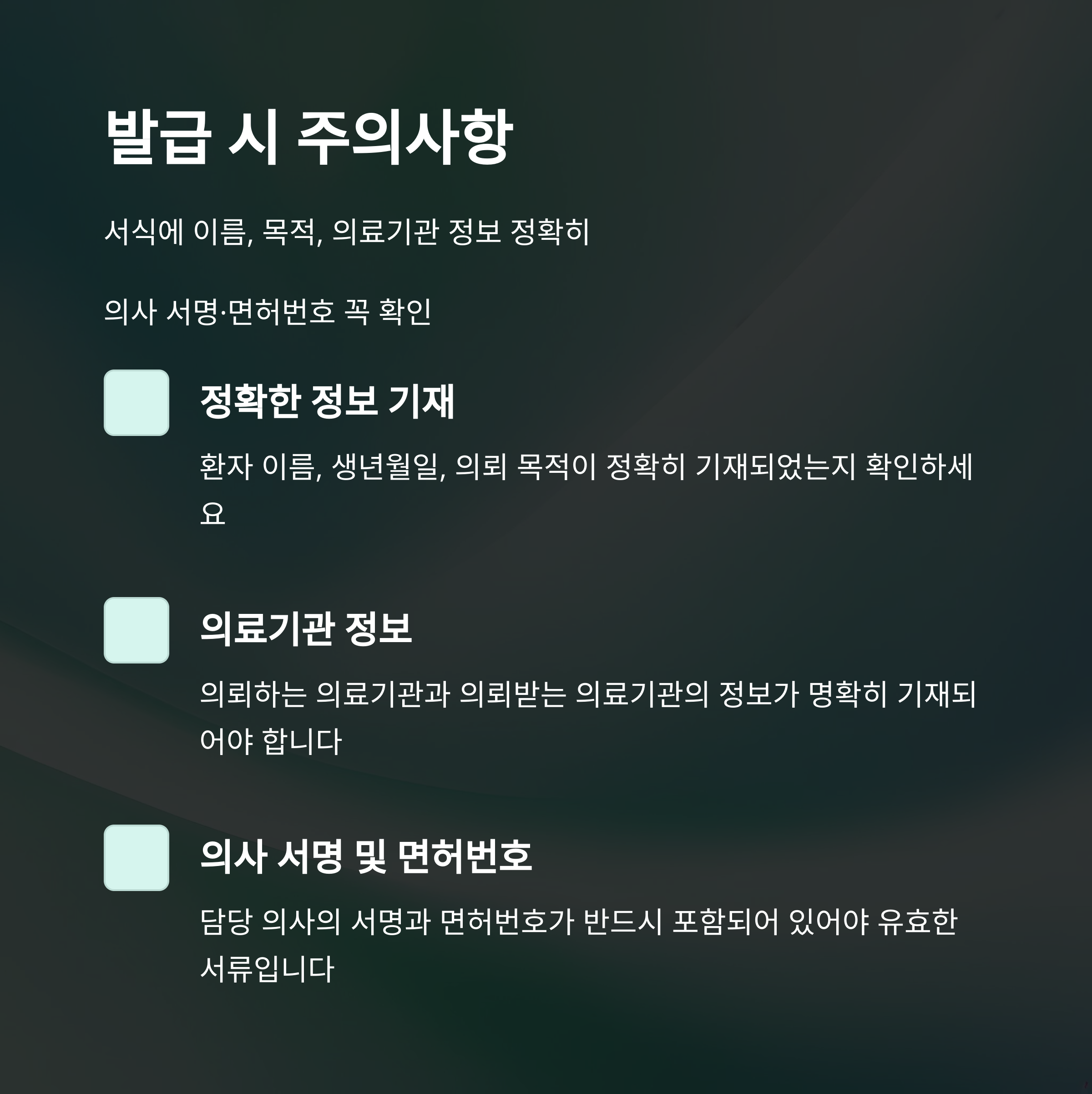 병원에서 직접 작성하지만, 사전에 진료 목적을 명확히 정리해두면 더 구체적이고 인정받기 쉬운 서류가 완성됩니다.