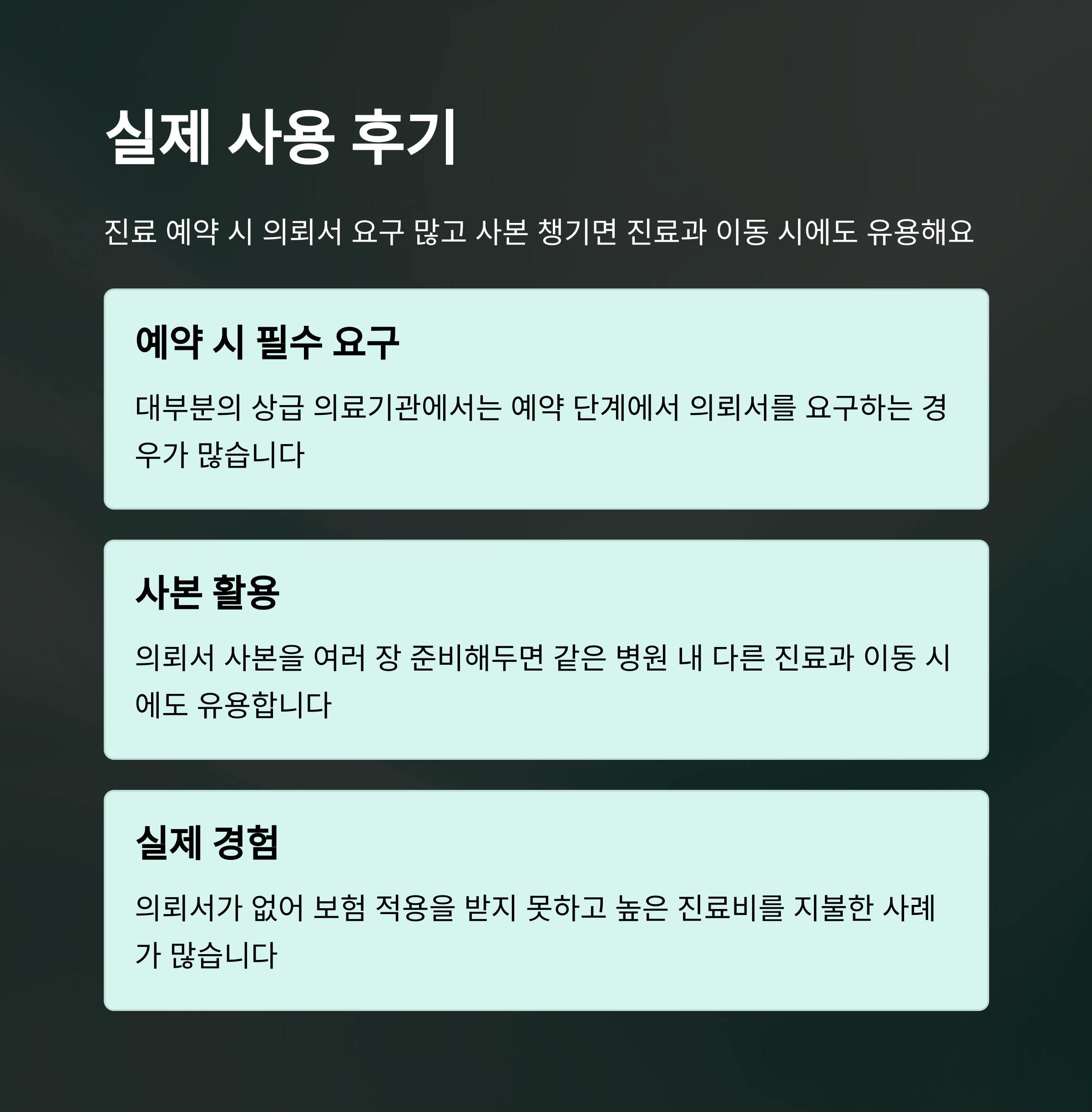 제가 직접 대학병원에 요양급여 의뢰서를 제출했던 경험을 토대로 말씀드리면, 미리 준비만 잘 하면 큰 어려움은 없었습니다. 진료 전 예약 시 의뢰서 제출을 요구했고, 접수창구에 서류를 내자마자 시스템 등록이 완료되었어요. 또, 주변에서 들은 후기 중에는 ‘서류 누락으로 본인부담금 100% 발생’한 사례도 있었기 때문에, 반드시 서류 사본을 한 부 더 챙겨두는 걸 추천드려요. 진료과 이동이 많거나 입원 예정이 있다면 특히 더 필요합니다.