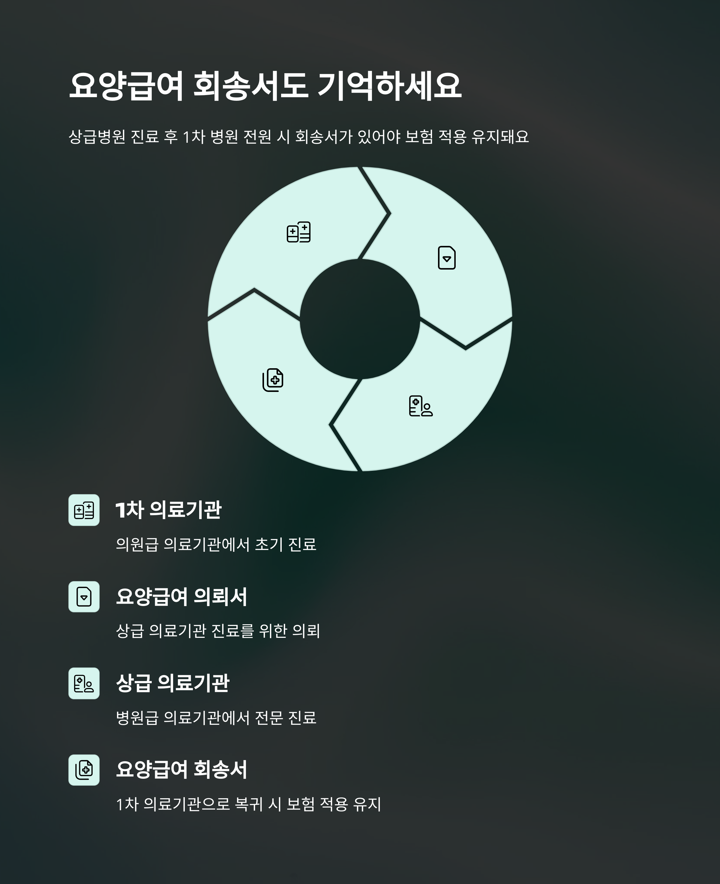 | 요양급여 의뢰서 | 전원 병원에서 요양급여 적용 가능하게 함 | 전문 진료가 필요한 환자 |