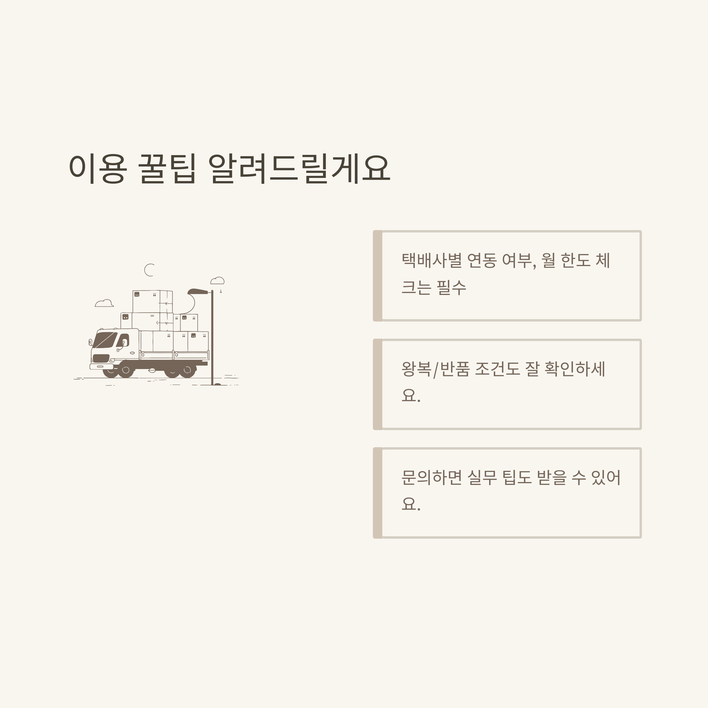 활용팁으로는 월별 한도, 추가 정산 방식, 반품/왕복 택배 정책 등 세부 기준을 꼼꼼히 체크하는 것입니다. 담당자와 통화하면 신청인원 초과시 대기자 등록, 분기별 우선순위 선정 등 실무 팁도 안내해주니 꼭 문의해보시길 추천합니다.
