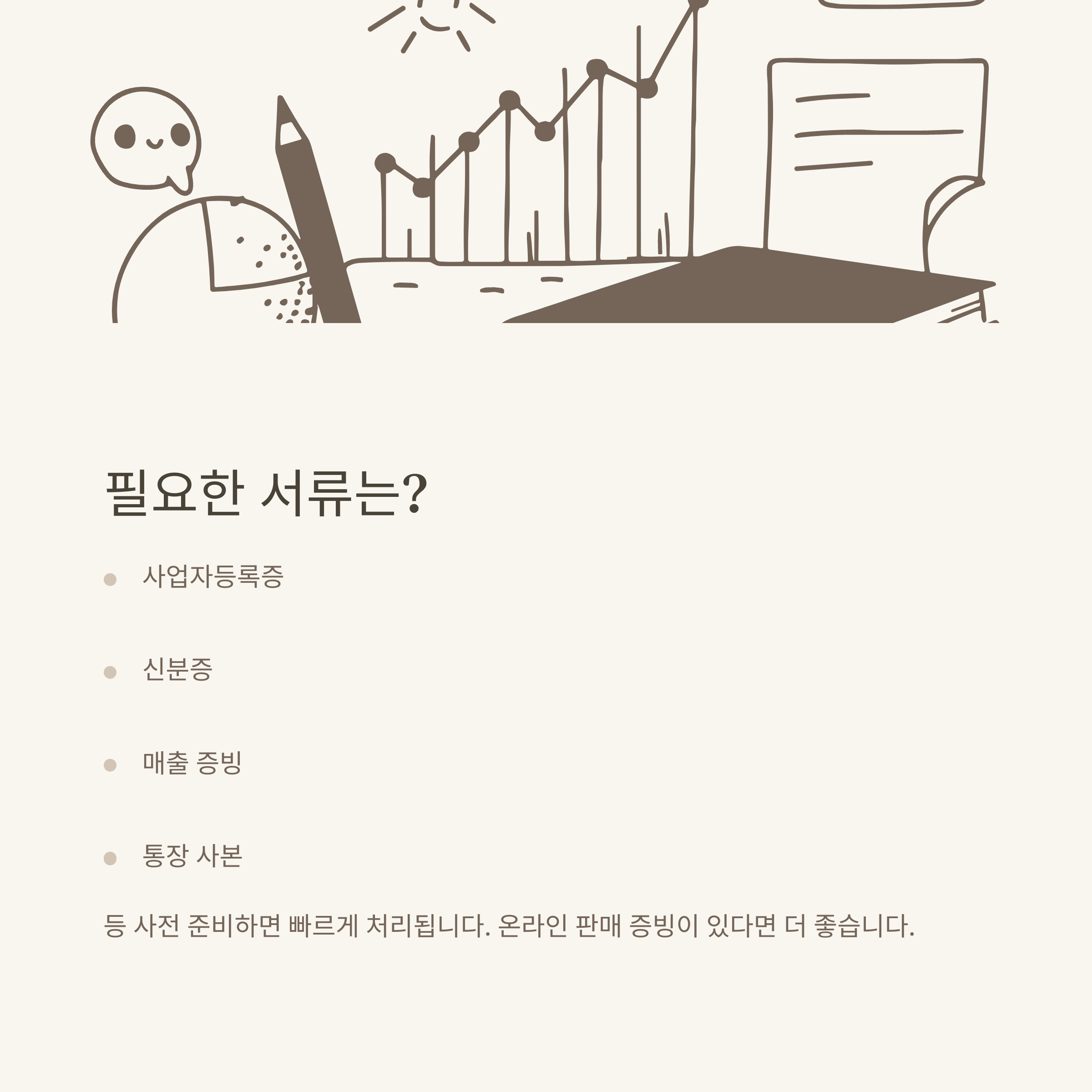 - 최근 3개월 매출 증빙(카드 매출전표, 세금계산서, 통장거래내역 등)