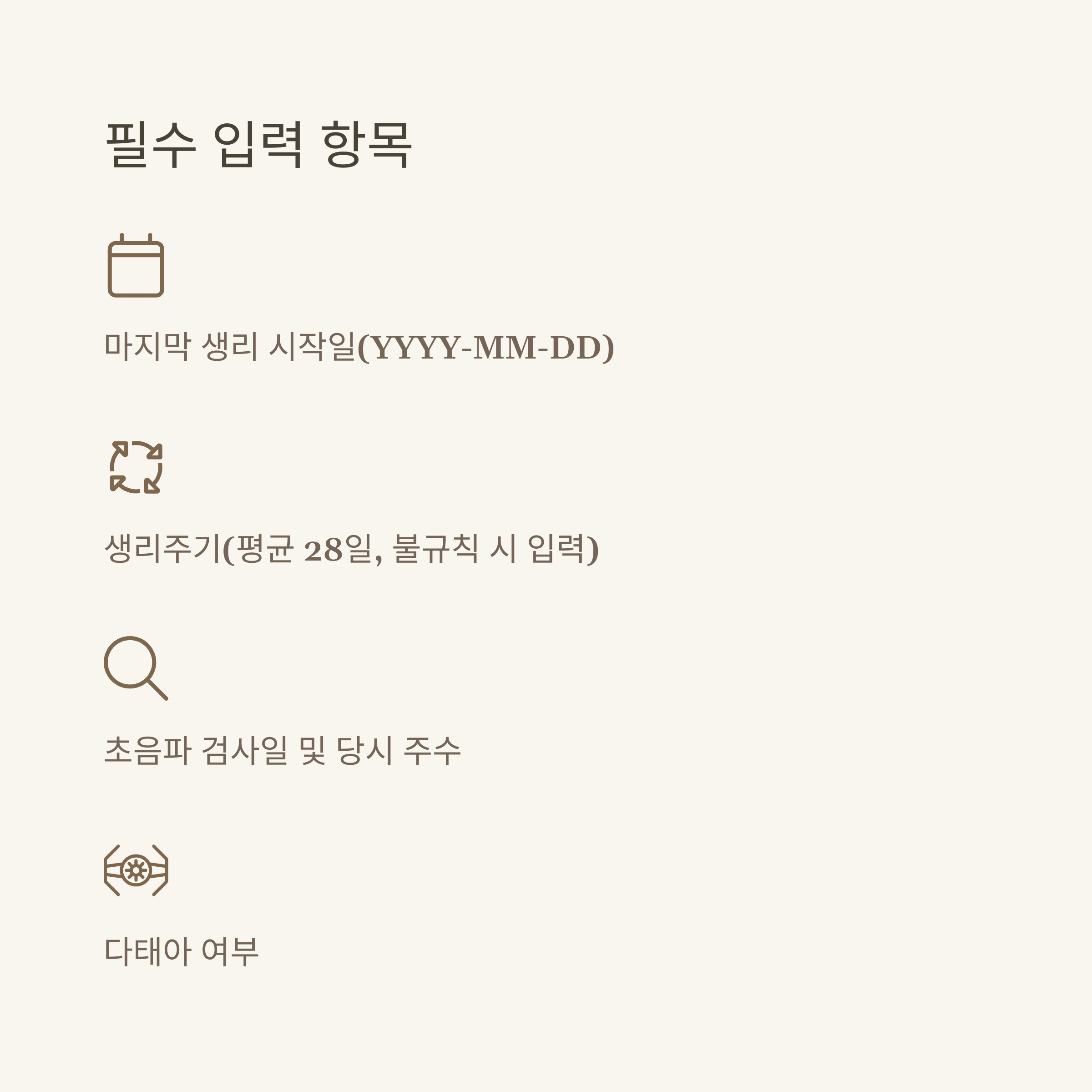 - 초음파 검사일 및 해당 주수(병행 입력 시 더욱 정확)