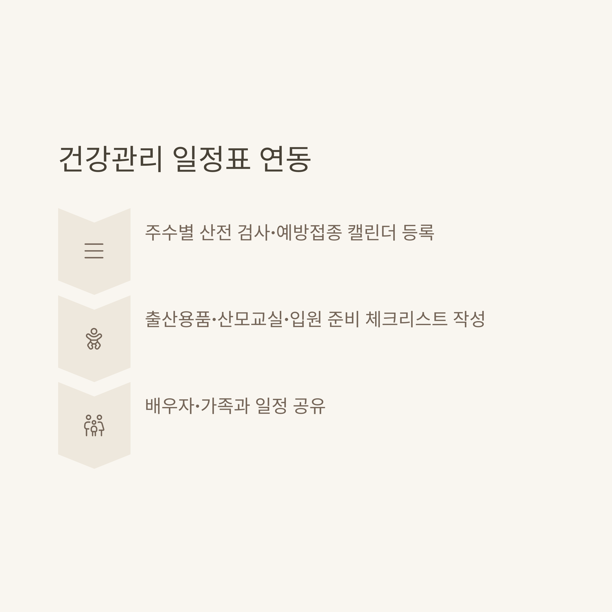 | 주수별 일정 | 검진, 예방접종, 준비 일정 미리 체크 |