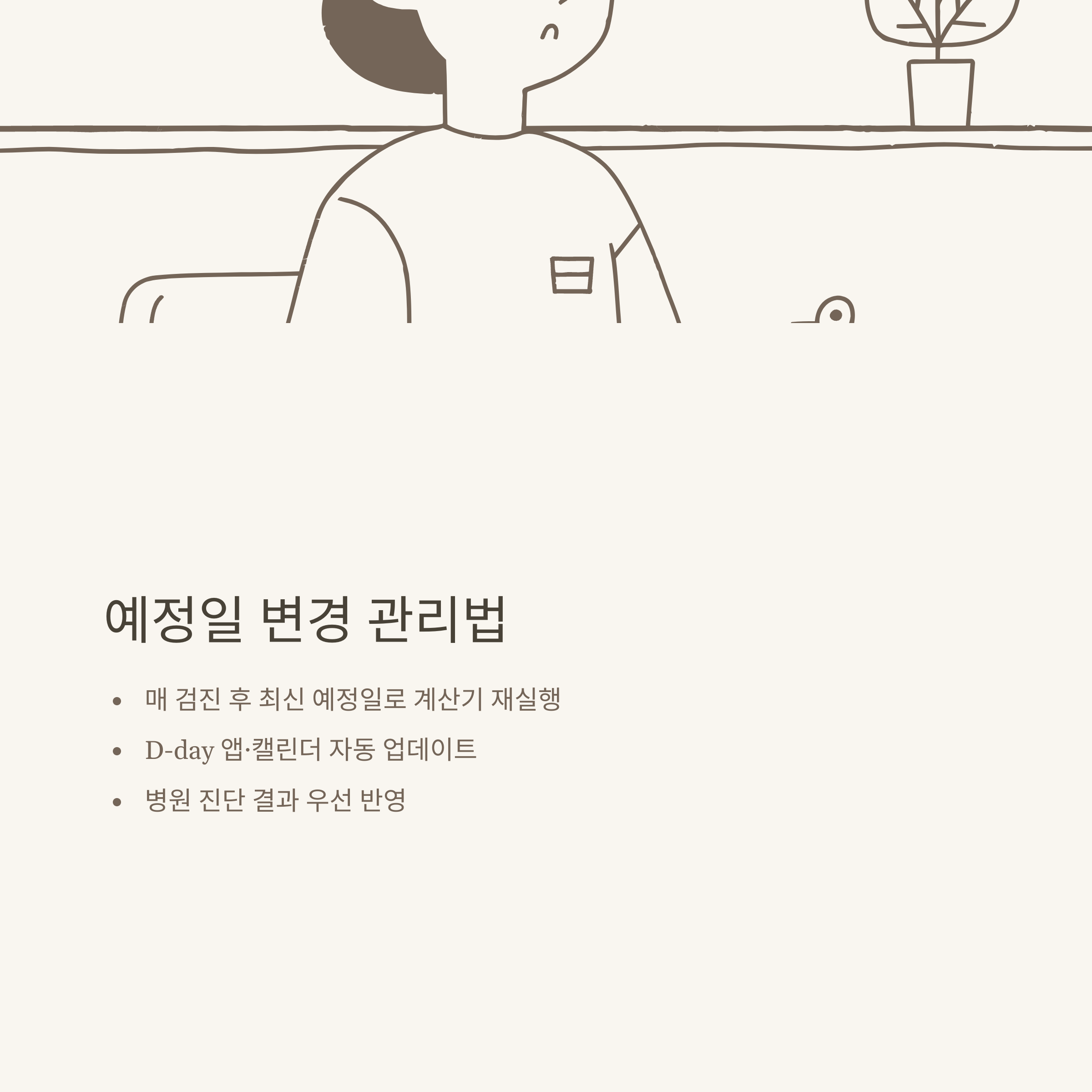 임신 기간 동안 예정일이 한두 번은 꼭 바뀌게 되더라고요. 저도 초음파 검진 때마다 “예정일이 조금 앞당겨졌어요” 혹은 “아기가 좀 작아서 예정일이 미뤄질 수 있어요”라는 이야기를 여러 번 들었어요. 이럴 때마다 당황하지 말고, 계산기를 다시 돌려 새로 조정된 날짜에 맞춰 일정을 계획하는 것이 훨씬 현실적입니다.